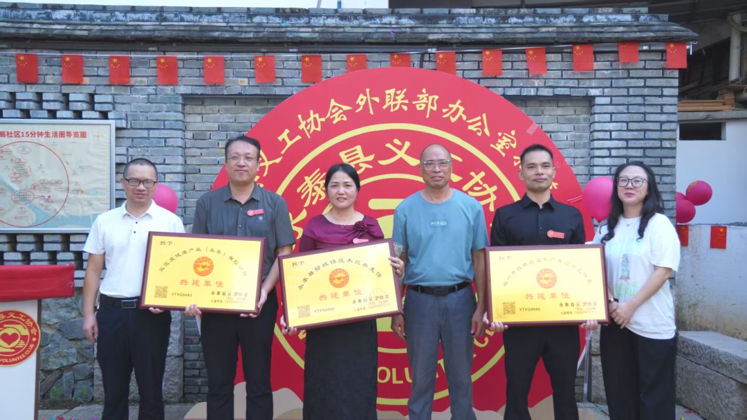 图为福州市永泰县樟城镇党委书记黄身灯(左一)、县慈善总会秘书长陈盛灿(右三)与相关领导共同为县义工协会共建单位颁发牌匾