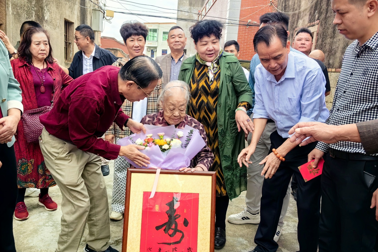 慰问组深入福清各镇,走访30位百岁老人,向每位老人发放500元慰问金,并送上寓意吉祥安康的“寿”字书法牌匾、长寿面、平安蛋、茶叶、山茶油等传统礼品。