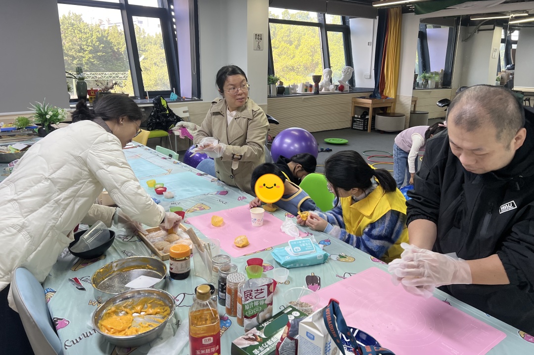 亲子协作环节温情满满。家长与孩子携手完成南瓜泥搅拌、麻糍搓圆、绿豆馅调配、饼皮包裹,亲子间的默契进一步加深。