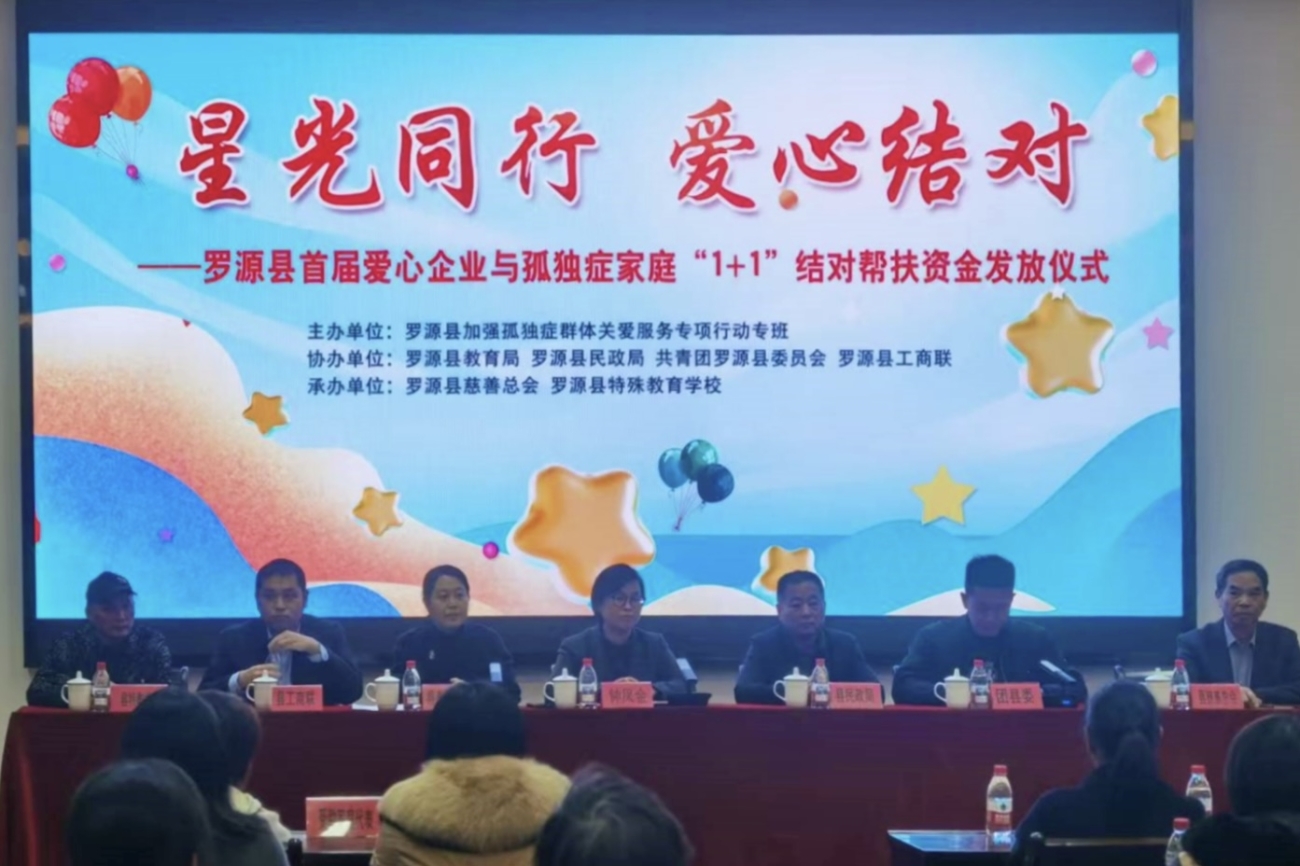 12月12日,以“星光同行 爱心结对”为主题的福建省罗源县爱心企业与孤独症家庭“1+1”结对帮扶资金发放仪式在中共罗源县委党校举行。此次活动由罗源县加强孤独症群体关爱服务专项行动专班主办,县教育局、县民政局、共青团罗源县委、县工商联协办,县慈善总会、县特殊教育学校承办,旨在通过搭建爱心企业与孤独症家庭结对帮扶平台,凝聚社会力量改善孤独症家庭生活质量。