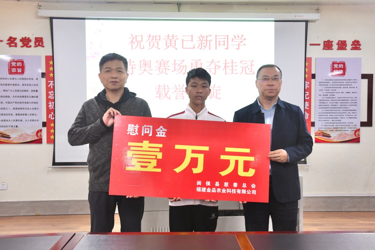 12月12日,闽侯县慈善总会携手福建金品农业科技股份有限公司前往闽侯职业中专学校,专程慰问载誉归来的黄已新同学,向其拼搏精神致敬,并为他送上1万元的慰问金。