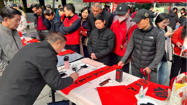 现场设置了志愿者写春联专区,由鼓楼区慈善总会邀请的书法老师们挥毫书写吉祥对联和“福”字,居民们有序领取,手写的祝福传递着浓浓的邻里温情。便民服务区人气旺盛,口腔检查、健康义诊、环保宣传等服务贴近民生,深受居民欢迎。工作人员还现场演示鼓楼慈善爱心捐赠小程序的操作流程,为居民参与公益提供了便捷途径。