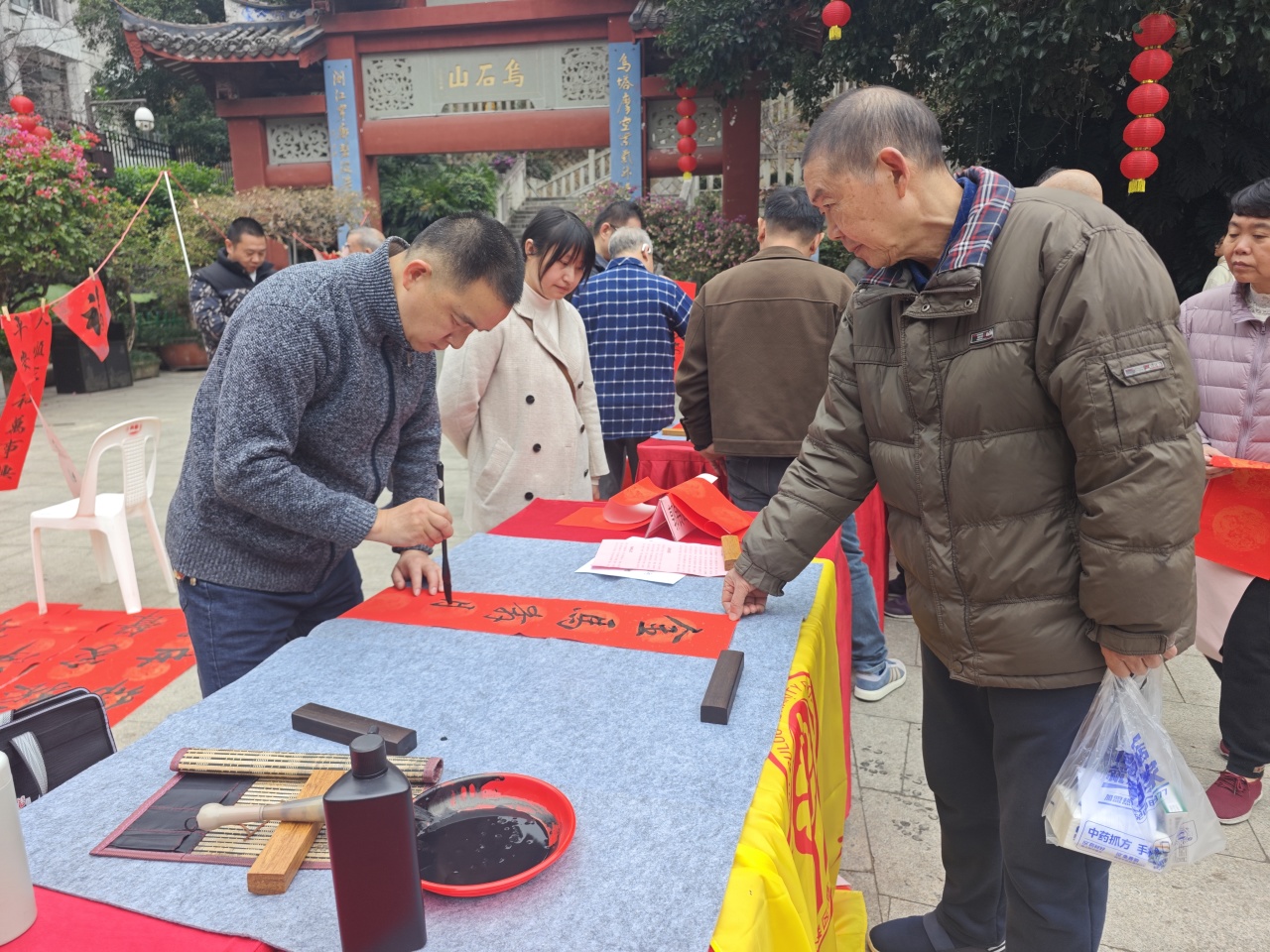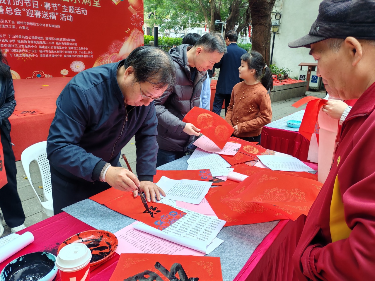 作为已连续开展四年的特色公益活动,笔墨送福环节备受居民欢迎。多位书法志愿者现场为居民书写春联和“福”字,福建省人大书画院院长叶双瑜也以志愿者身份参与书写,陈元邦、温佳禄等老同志以及福州市慈善总会副会长庄严一同参加。活动现场墨香洋溢,居民争相领取春联,直呼“年味儿十足”。