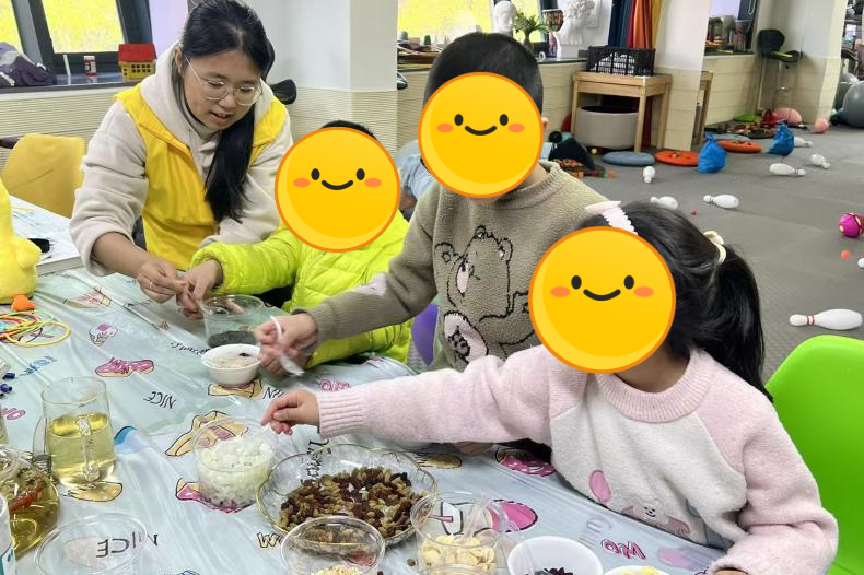 活动中,十余名“星宝”在志愿者引导下,亲手为拗九粥添加冬瓜糖、芝麻、花生碎等传统配料,在动手实践中感知节日习俗,增强社交互动与表达能力。随后,孩子们将熬制好的粥送到家长手中,有的轻声说出“请妈妈喝粥”,有的在鼓励下为奶奶喂上一口甜粥,令现场家长和志愿者感动。