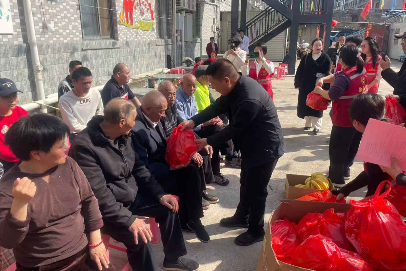 图为永泰县慈善总会会长余斌(中)带领慰问组为敬老院老人们送上慰问品