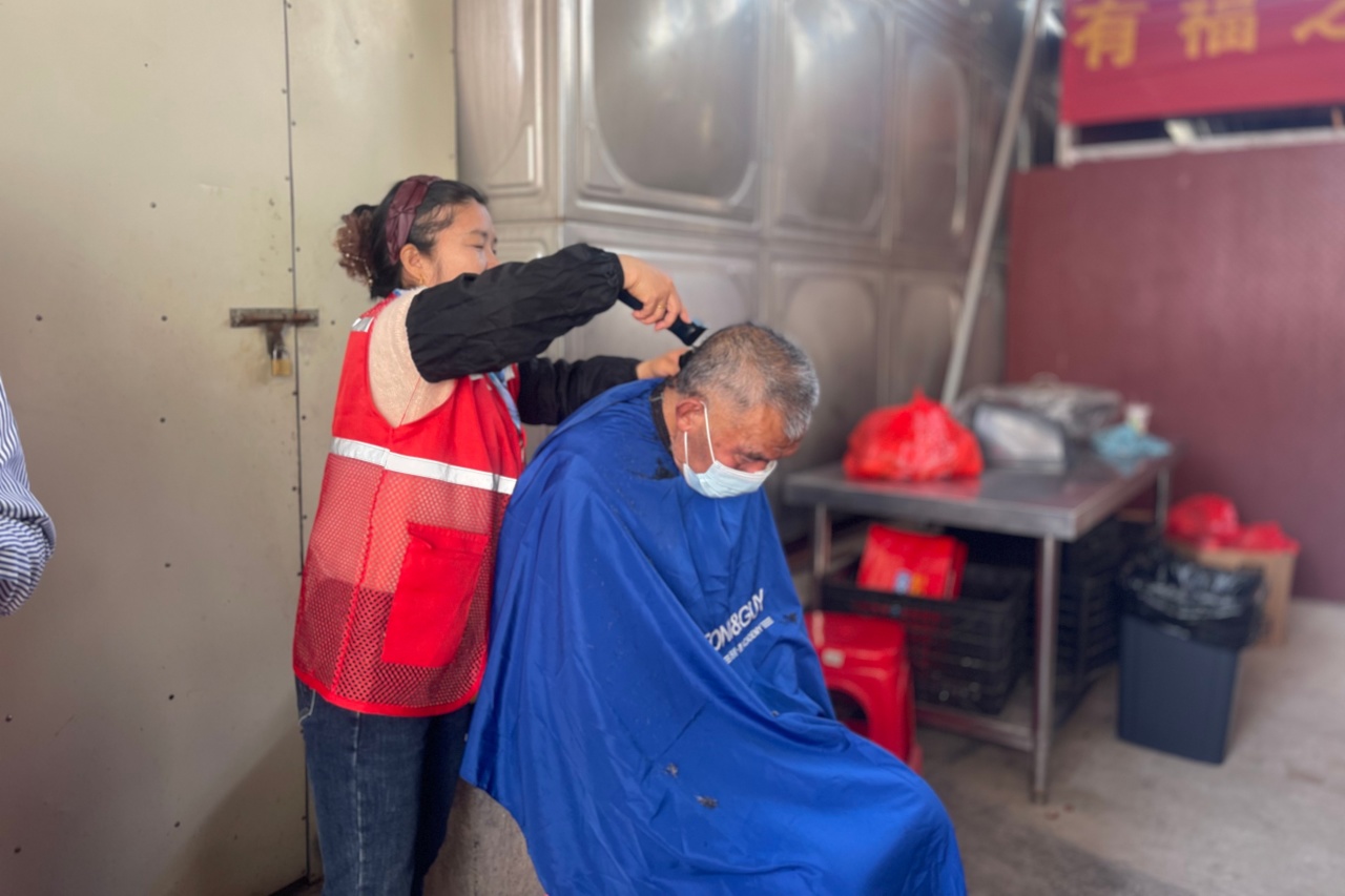 图为志愿者为老人们理发
