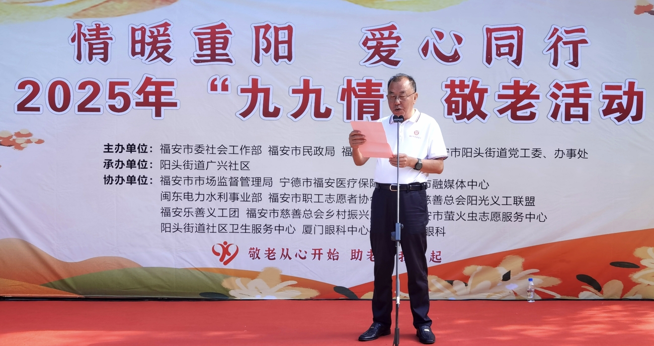 秋高气爽,人寿花香。在2025年重阳节来临之际,为弘扬中华民族尊老、敬老、爱老、助老的传统美德,推动新时代文明实践活动走深走实,10月29日,由福安市慈善总会联合市委社会工作部、市民政局、阳头街道党工委共同主办的福安市2025年“九九情”敬老活动在阳头街道广兴社区温情启动。本次活动以“情暖重阳 爱心同行”为主题,凝聚社会各界爱心力量,为社区老年人送上节日的诚挚问候与暖心关怀。