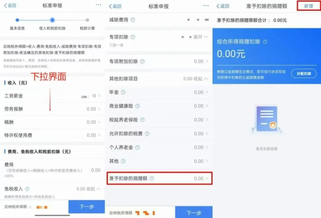 第二步:点击“准予扣除的捐赠额”、点击右上角“新增”,开始填写捐赠票据信息。流程如下图: