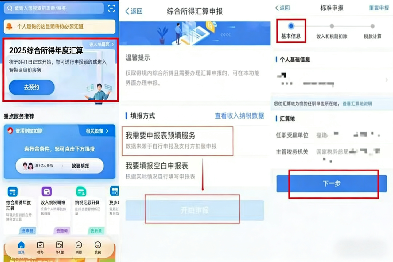 第一步:进入“个人所得税APP”页面,点击“2025综合所得年度汇算—开始申报”;或者在【常用业务】栏目点击【综合所得年度汇算】选择申报年度“2025年度”进入,根据您的实际需要选择填报方式,这里以“申报表预填服务”为例。在阅读并确认相关规则及基础信息后,进入标准申报表。流程如下图: