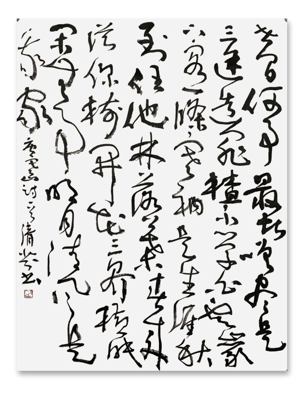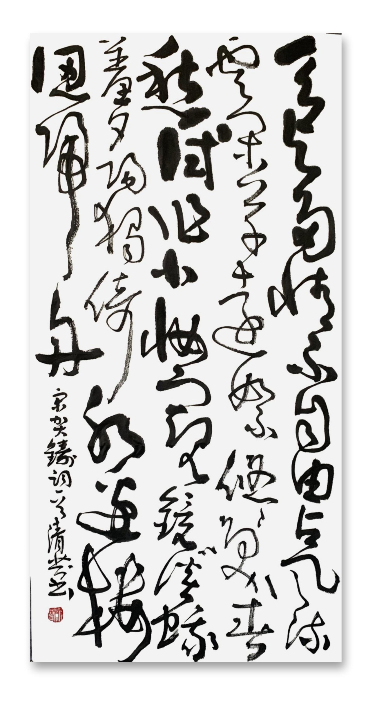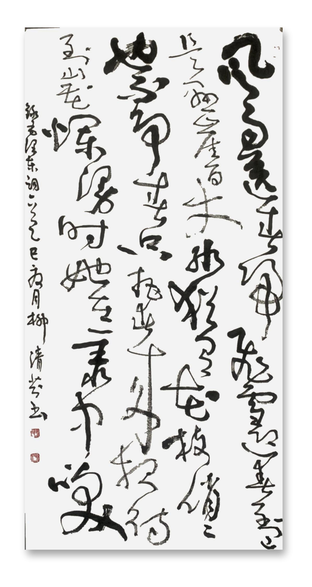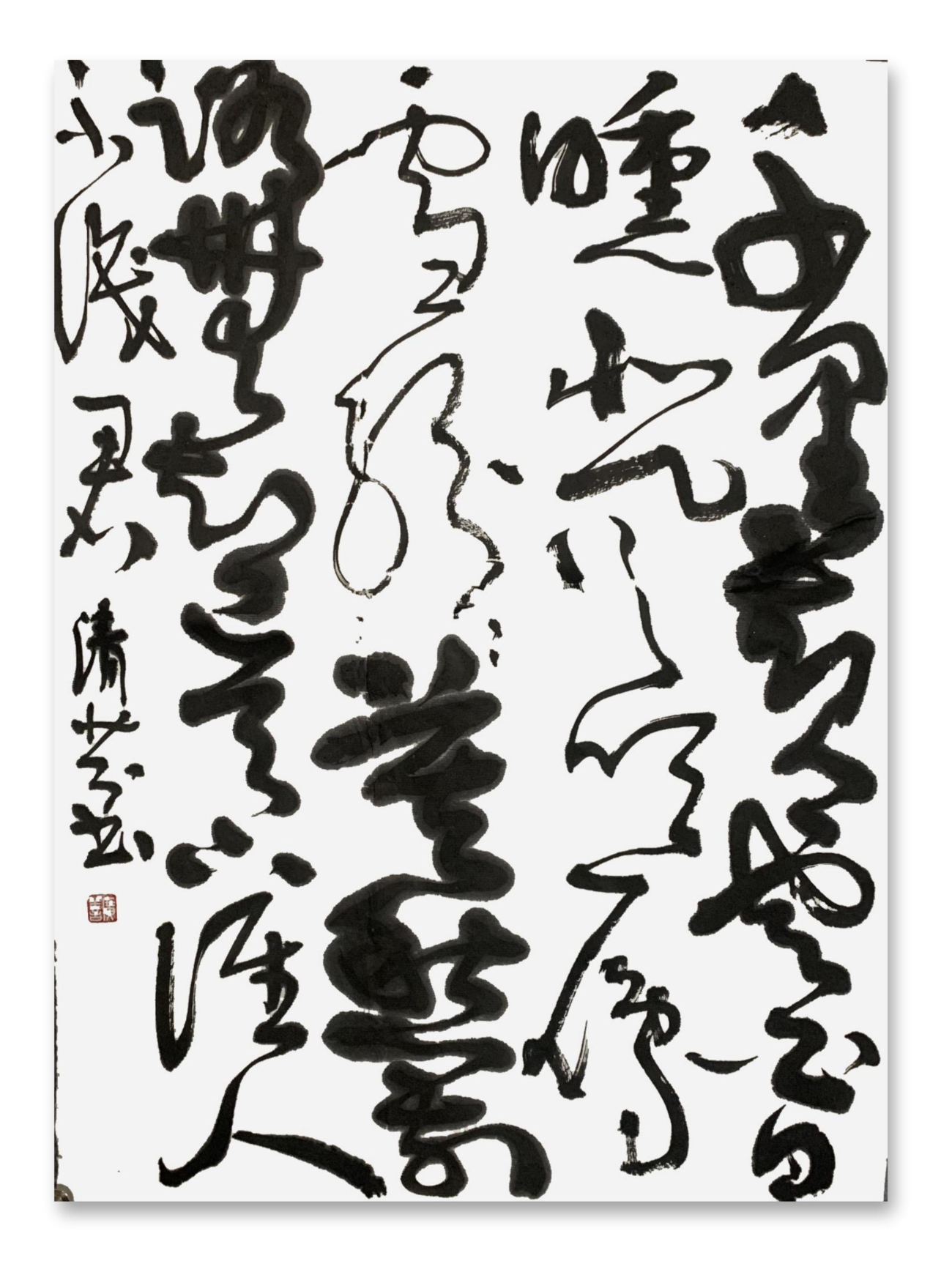 我们注意到:她的草书线条粗细变化明显,浓淡枯湿、行笔迅健、用笔有力、跌宕有致、变化万千。有颜筋柳骨、鸳飘风泊之气势、且不乏隽永洒脱。