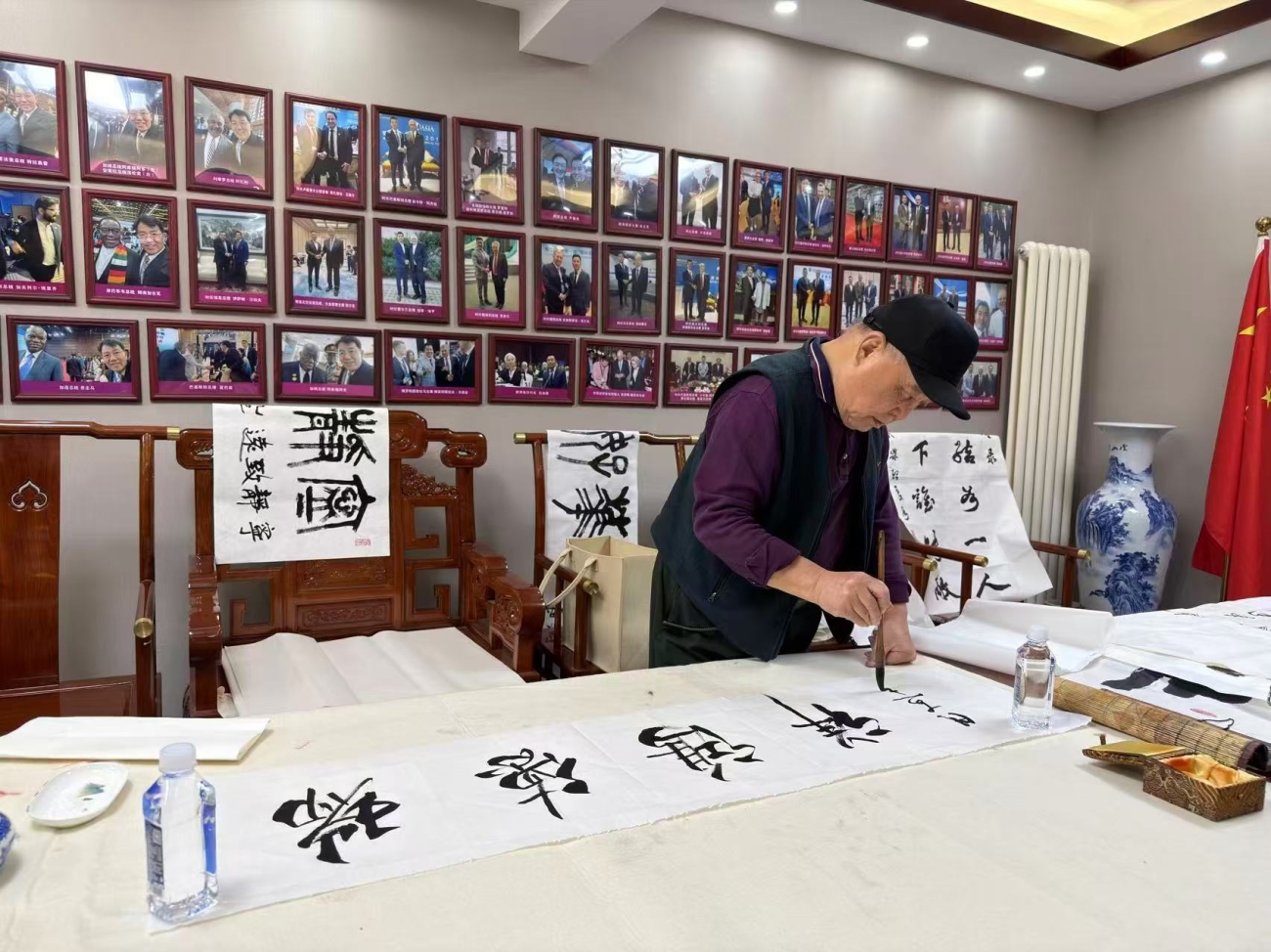 为了让中国文化走向世界,前几年,我曾到欧洲和非洲举办了一个国学展,主要内容是从易经、道德经和孔孟、庄子等著作,选择经典之句,用书法创作“舞动的中国”文化书法作品展,深受国际友人的欢迎。我所做的这些,我认为作为一名书法工作者在这个时代应有的责任和义务。特别是启功先生培养了我,我应向启功先生学习,要为这个时代承担责任,要用书法来歌颂我们的祖国,歌颂我们的人民,歌颂我们的英雄,歌颂我们这个时代。之前,我给航天员上课,期间,给航天员们每人写了一首诗,航天员也是我们国家的英雄,我用书法来歌颂英雄,也是为讴歌这个时代。另外,我的书法作品“中国梦”随神舟十号飞船飞上了太空,后被中国人民革命军事博物馆收藏,我感到既光荣又骄傲。