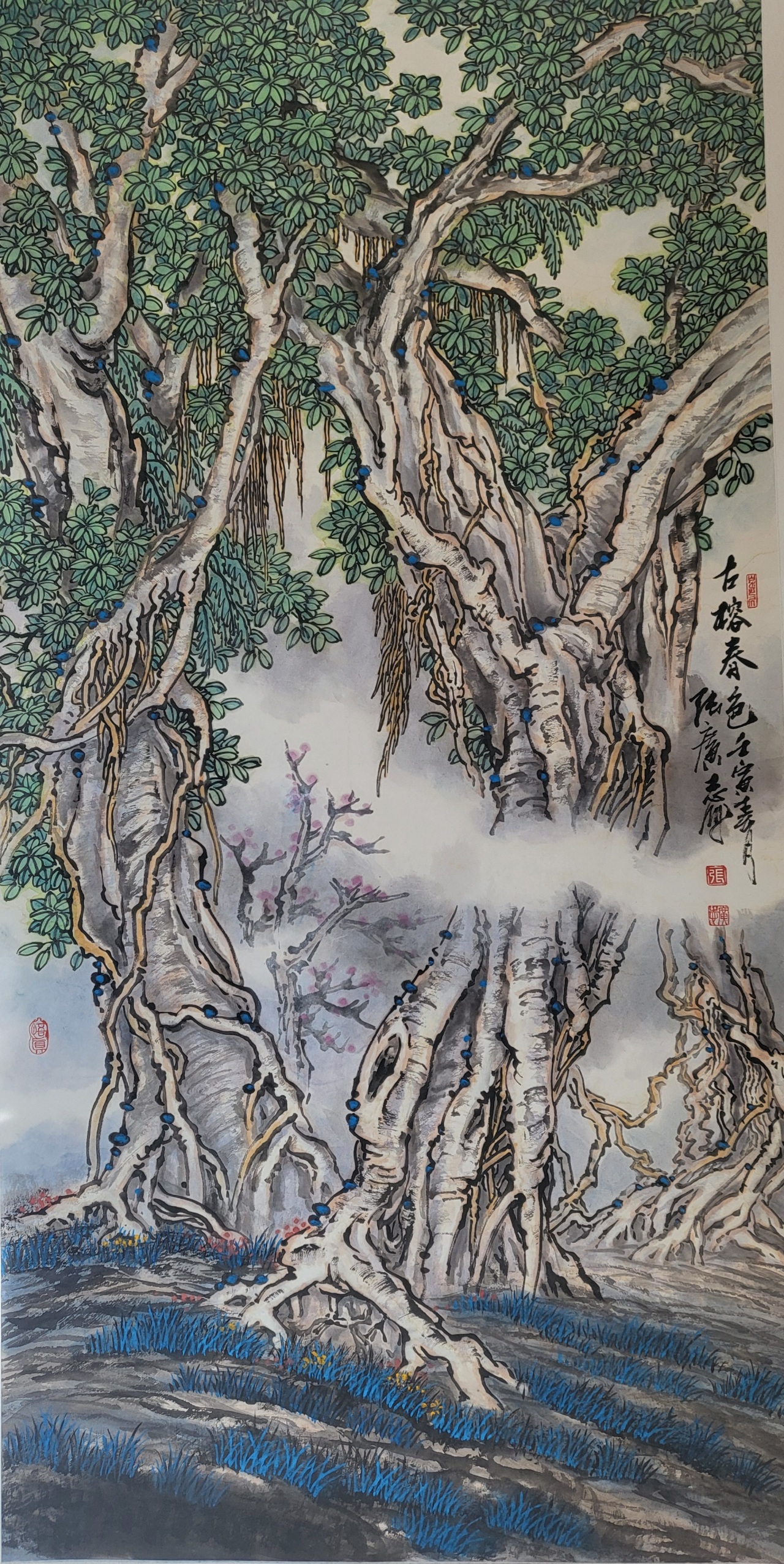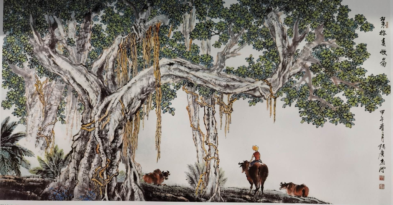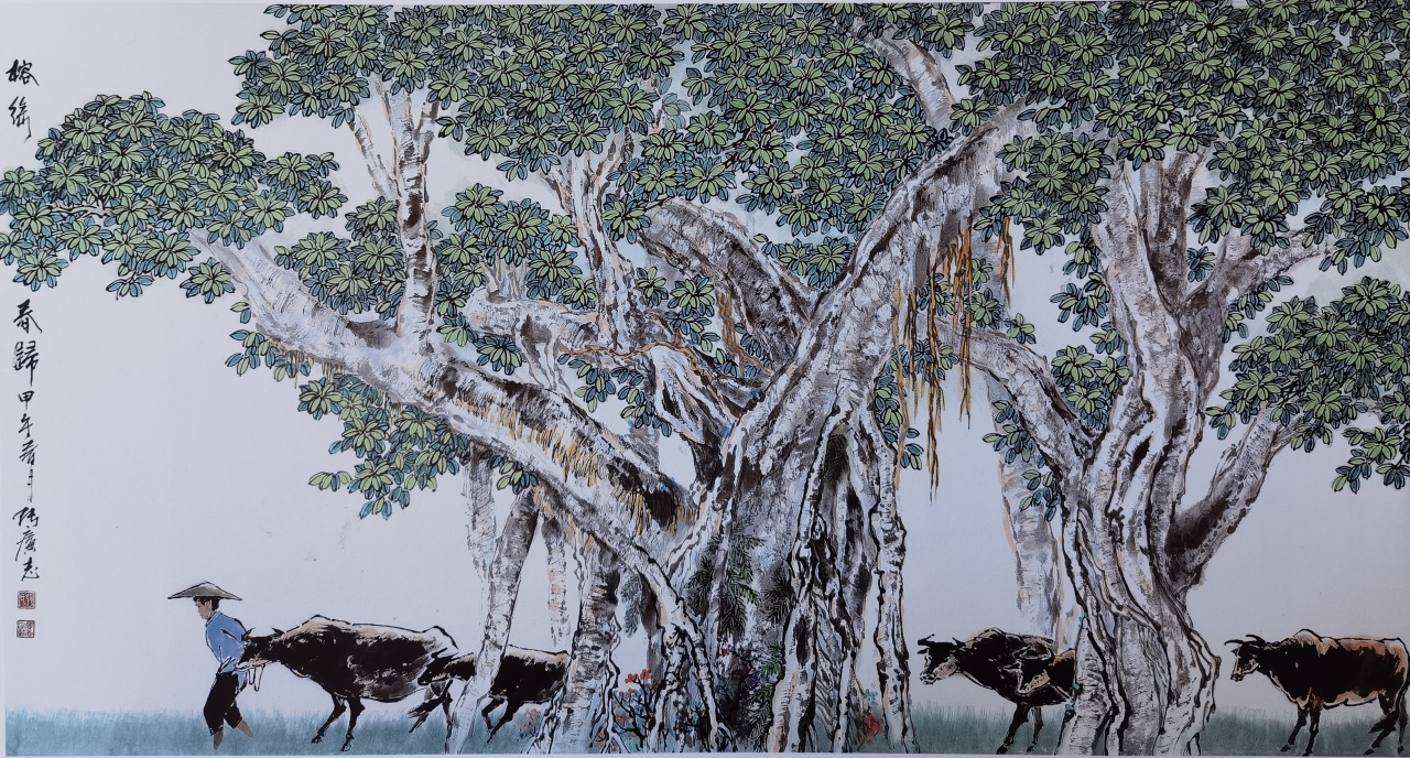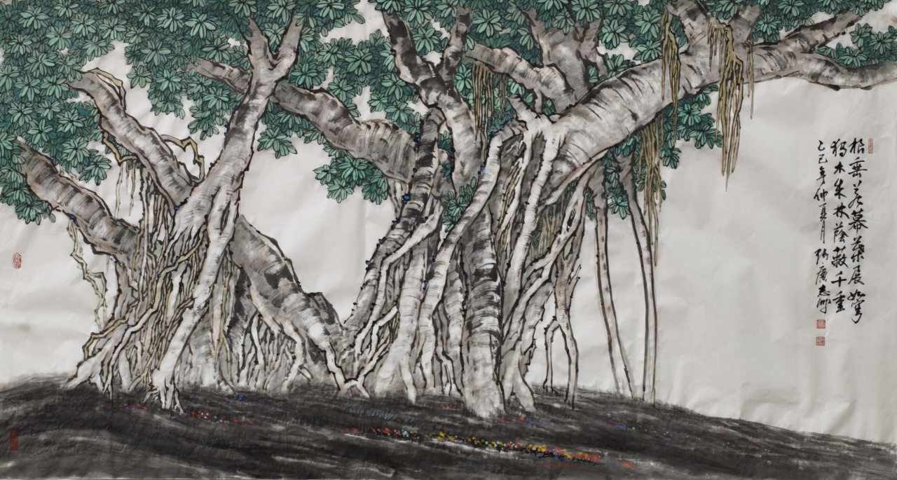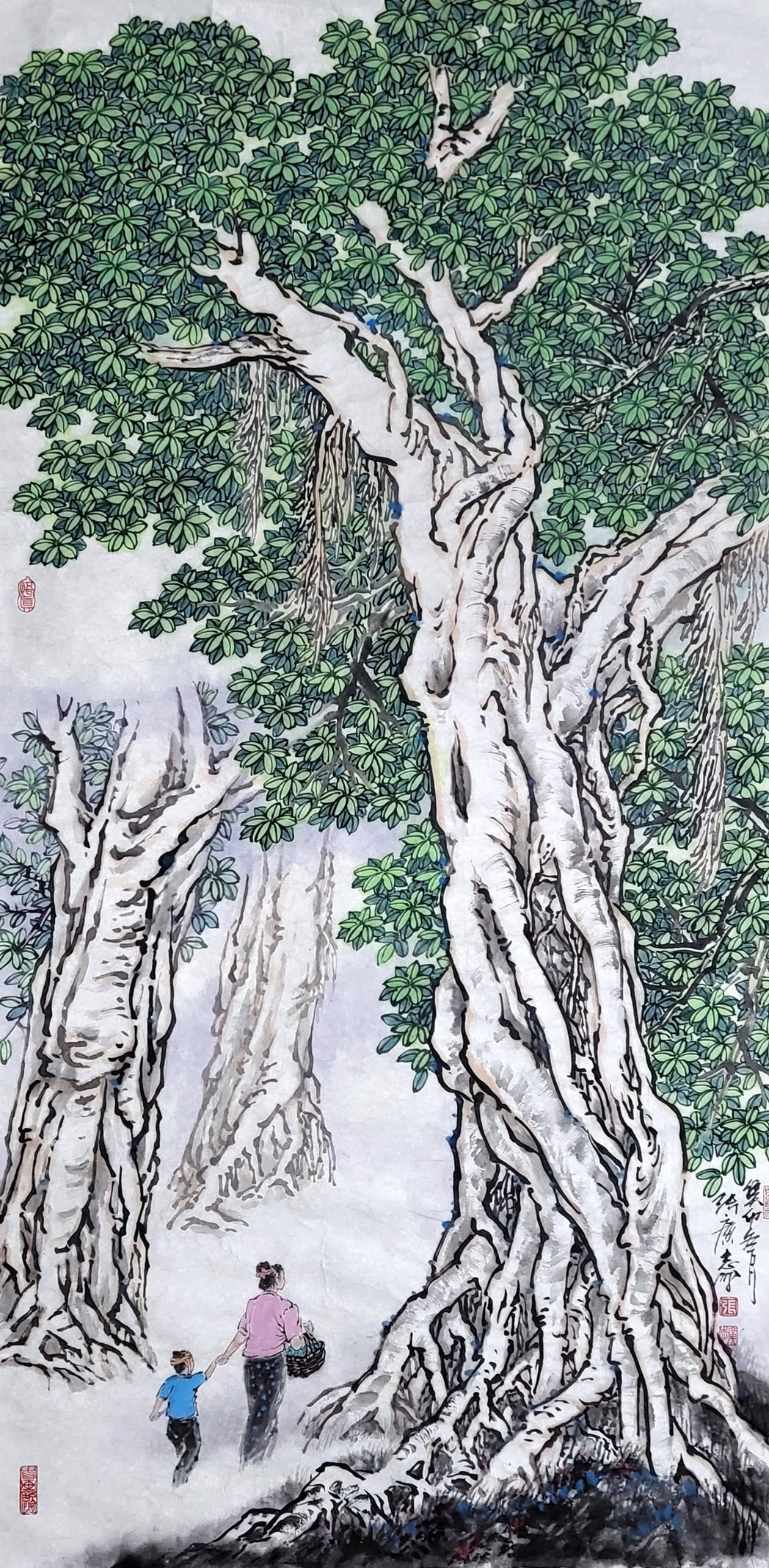 在西双版纳边界打落镇,我与黄老师画榕树“独木成林”时,早点只吃了两根香蕉,因写生地点与居住的寨子相距40多里路程,中午无法回寨子吃午饭,我们饿了就喝水充饥,直到下午三点多有个卖香蕉的妇女经过这里打歇,我们两人才又吃了香蕉,并且一直坚持到黄昏才把写生稿画完。现在回想起来,那时虽然异常辛苦劳累,但心中还是很美的,因为画好了一幅对创作有用的写生稿。