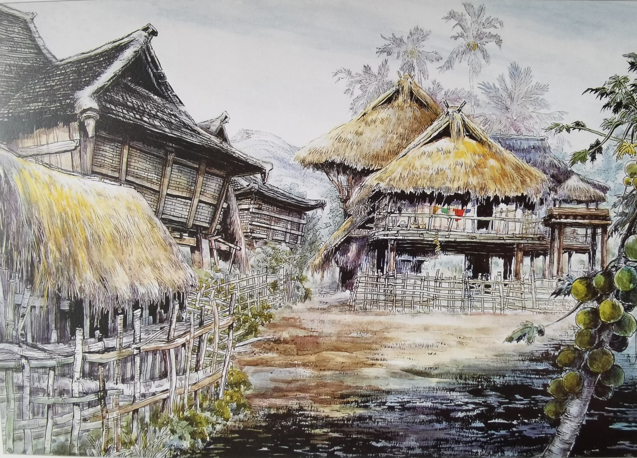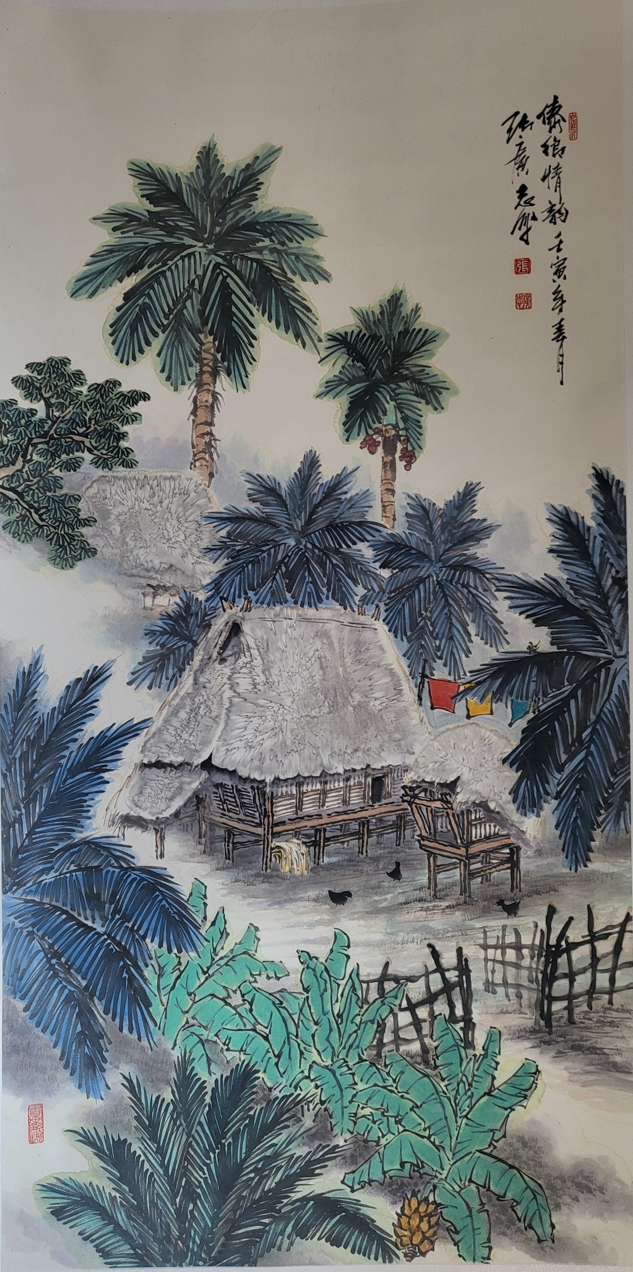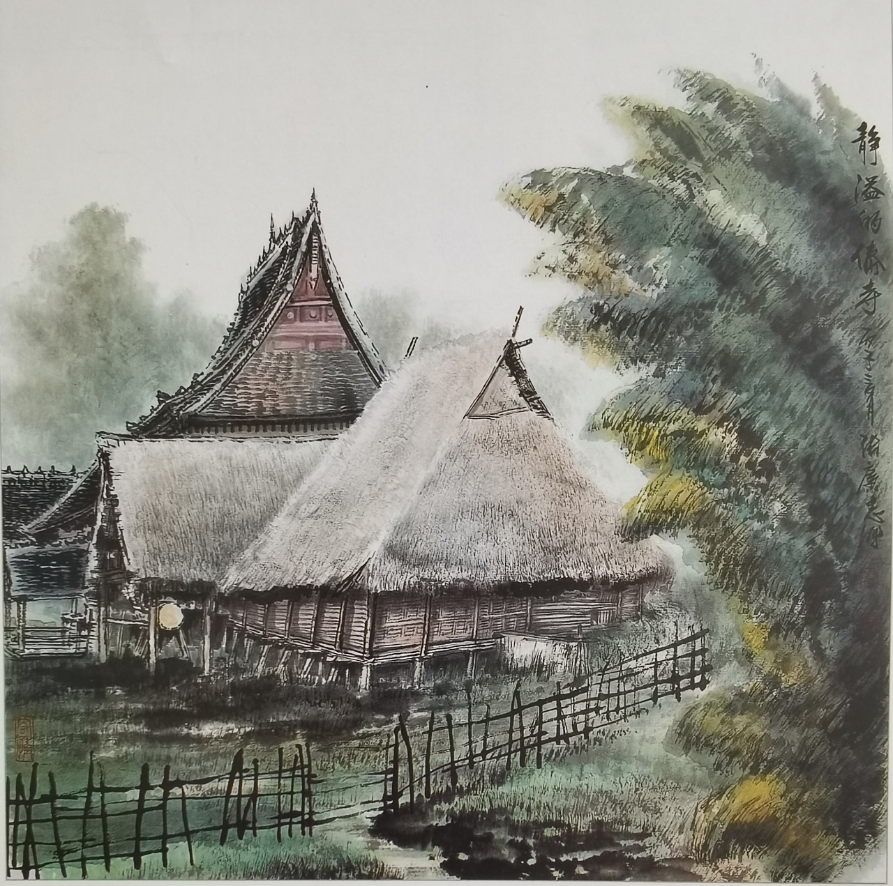 九十年代的西双版纳管控得还十分严格,因属边境省份需换边防证才能进入,我们进入到西双版纳地界时,就感到这里的空气与北方截然不同,异常湿热。当我看到远处的原始森林浓荫深厚、宛若绿云,群树间偶有少数民族妇女穿着艳丽颜色的民族服装在林间穿行,我情不自禁的自语道:这是多美的画啊。当走进傣寨看到茅草顶的傣家竹楼,我更惊诧不已,结实木结构的框架,蓬松的山草做大屋顶,这种建筑多么原始古朴,更觉入画,有味道!这样的美景,我感到无论画油画、水粉画、水彩画、中国画都很适合表现。