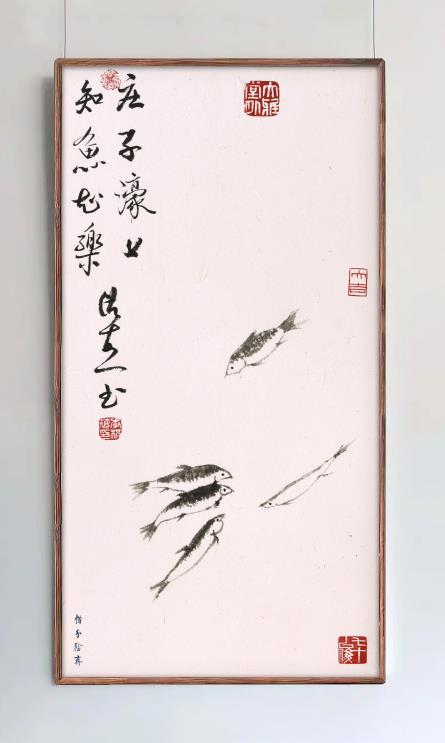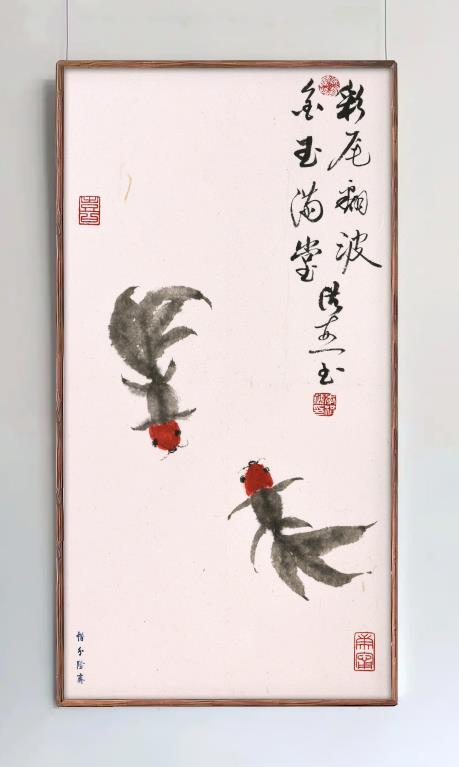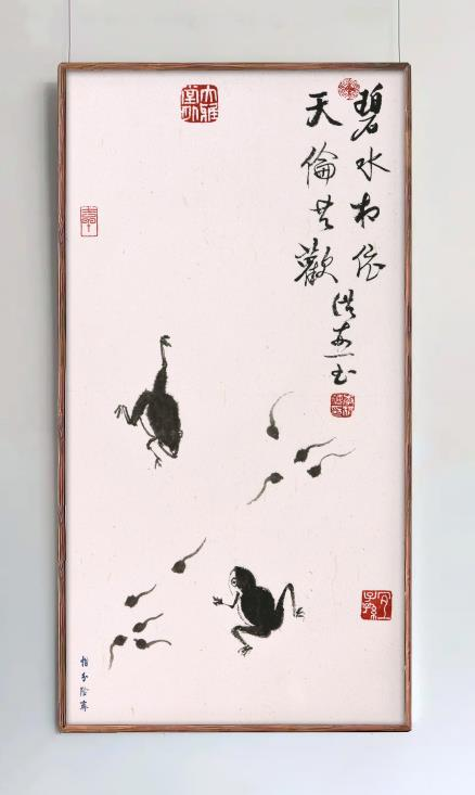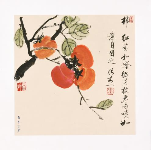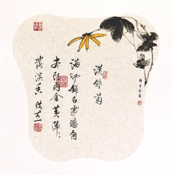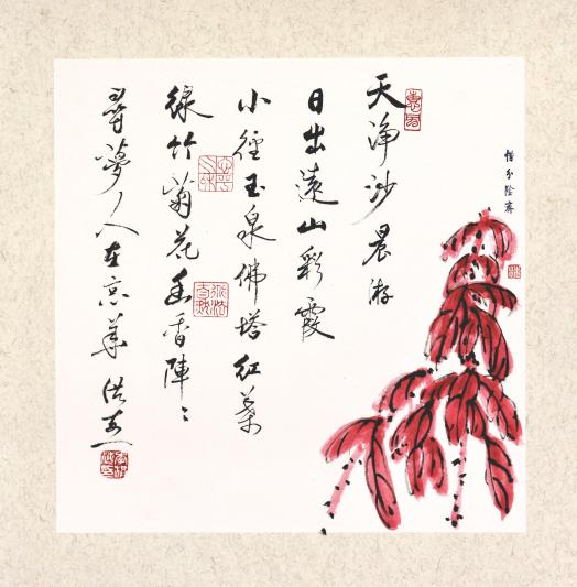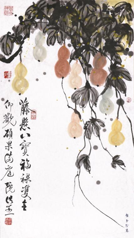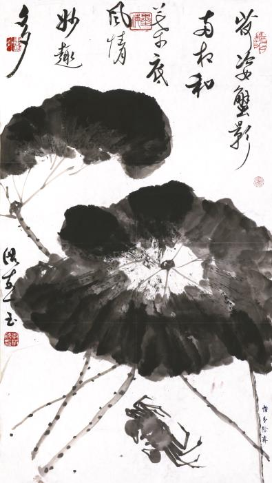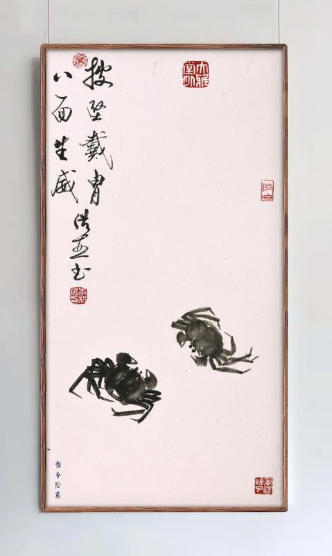 【蔡成刚】:我们看到了您的创作作品很精彩,大家都很喜欢。这些作品充分展现了中国画“画中有诗、诗随画生”的独特风貌,再次印证了这一艺术传统在当下的生命力。实际上,中国画最大的特点就是主张神似、用意第一,更注重“文以载道”“以形写神”。细品您的每幅作品,虽然尺幅不大,却意境深远。梅、兰、竹、菊、葫芦、荷花、稻穗、红叶、萝卜、螃蟹,皆取寻常之物入画,却于平淡中见真情,于简约中见精神。每一幅画都配以自撰诗句,或汉俳,或小令,语言简洁含蓄,如同从画面上自然流露出的心语,使诗与画相互激发。诗以文字抒情,画以图像传神,形成“诗中有画、画中有诗”的意境。而且每一幅作品都是以书法入画,用笔提按有度,线条潇洒而富于内蕴,浓淡交替,空韵相生。一抹浓墨、几笔淡彩,便能勾勒出画面的节奏与呼吸。梅枝如铁、竹叶如风、葫芦藤蔓盘绕而不乱、螃蟹前脚灵动生姿。毛笔、纸材、墨彩、宣纸,相得益彰。精美的书法题款与绘画融为一体,使画面更具韵律和表现力。中国画用笔用墨十分讲究,谋篇布局、构图也十分重要。您能给我们介绍一下吗?