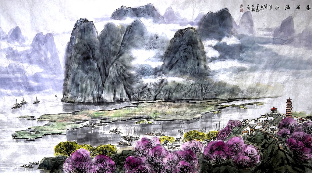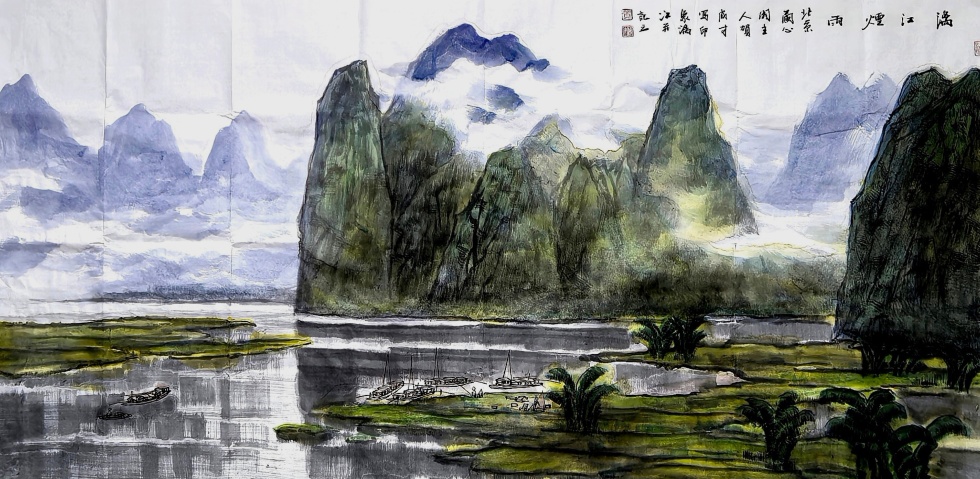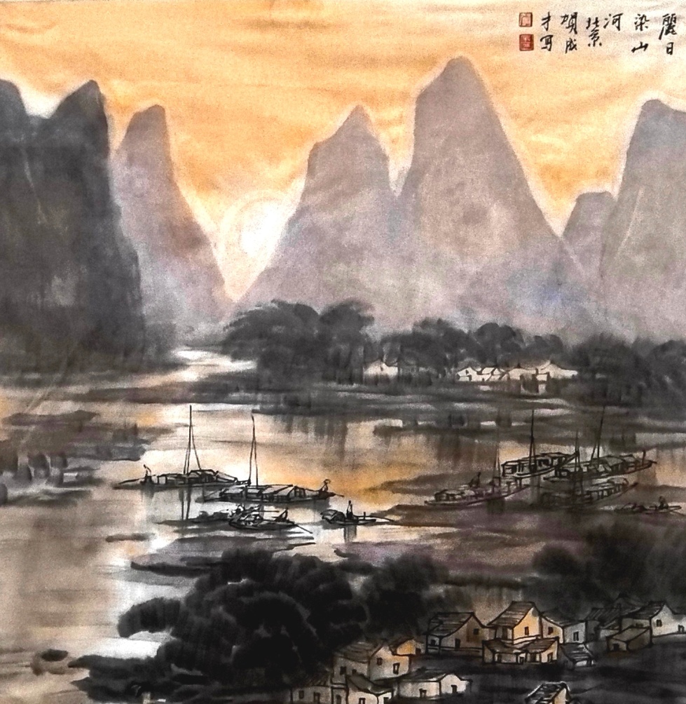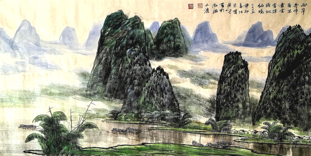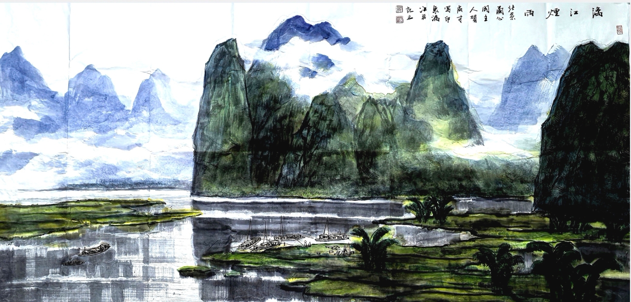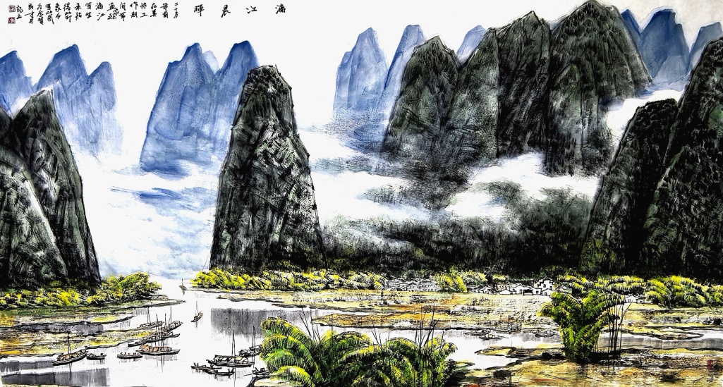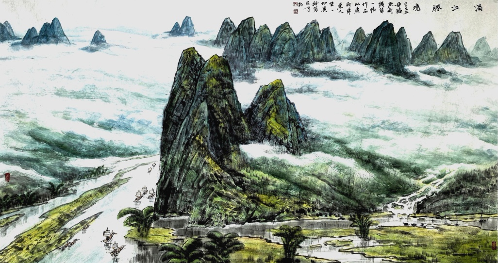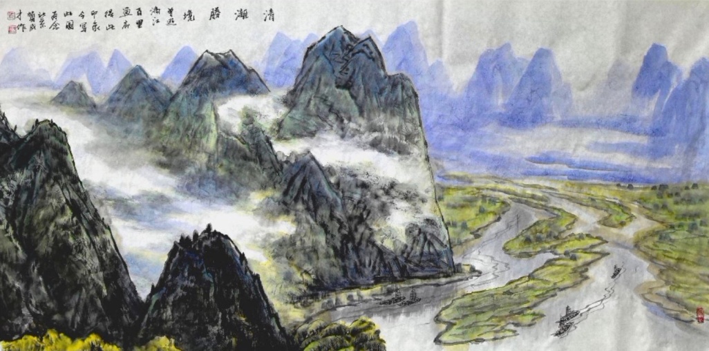 在长期的创作实践中,大胆创新,师于前人,又不拘泥于前人,本着以传统与时代性、中西融汇、探索创新的艺术理念,形成了清新、飘逸、质朴、典雅的彩墨山水画技法独立体系。
