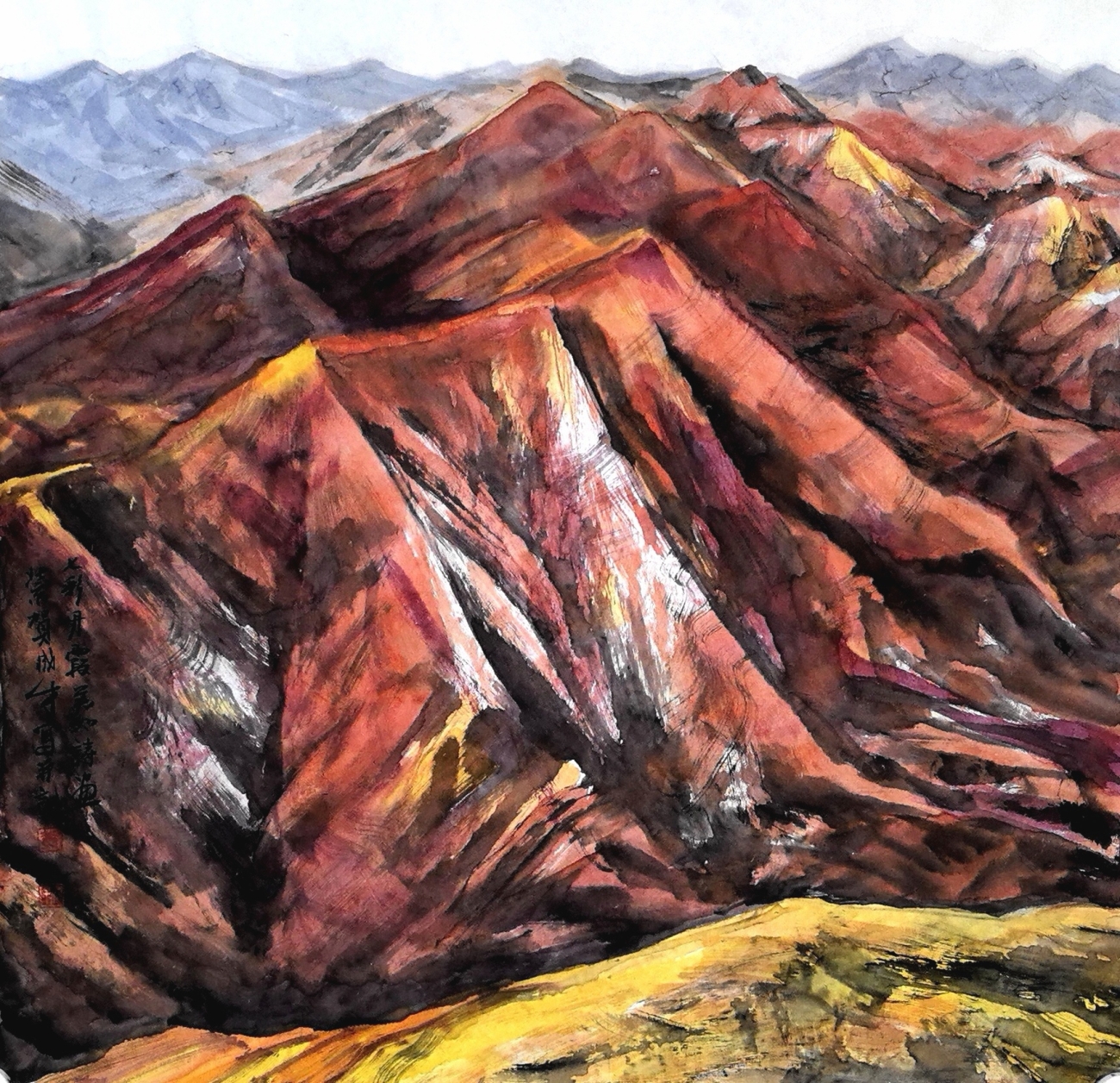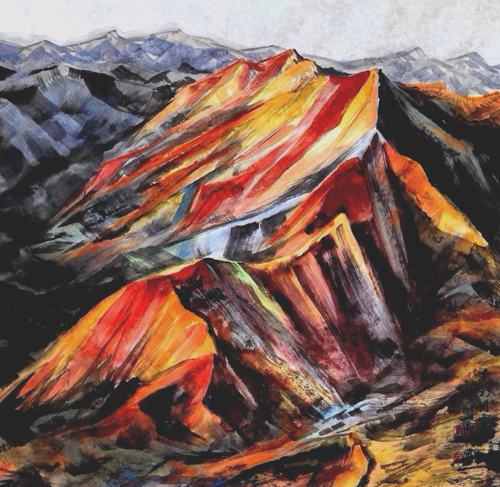 这种文化场域的转换,促使我的彩墨语言必须作出相应的调整。在肃南,我以塞尚式的几何解构处理丹霞地貌;而在衡山,我更需要用笔墨的灵动和丰富多变的色彩来表现这里湿润氤氲的山体质感。但不变的是我始终追求的中西融合之道,将西方对光色的敏锐,内化为中国画的笔墨情感。