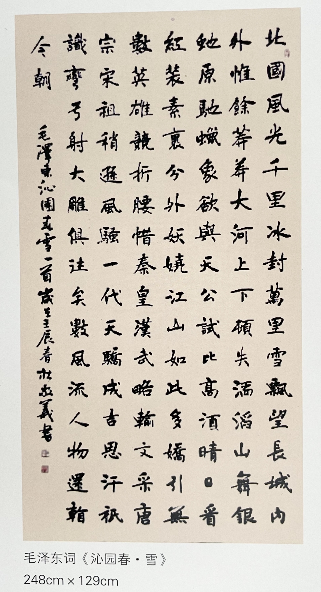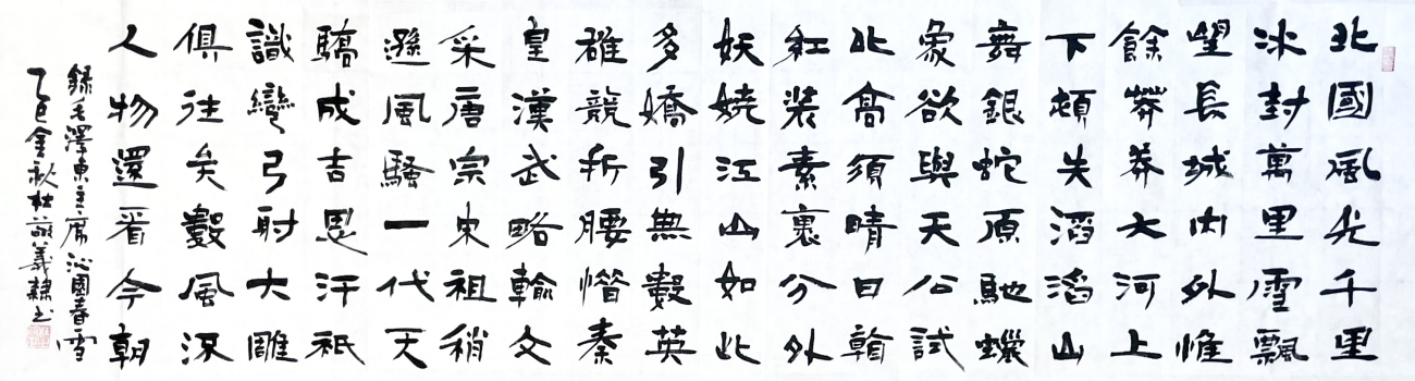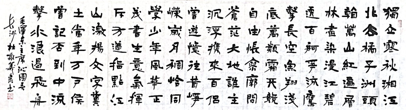 作为中国书法家协会的资深会员,随着其知名度的提高,杜敬义的楷书作品在全国各地有多处被刻入碑林,在全国各大场所收藏,并被《求实》杂志社主办的《红旗文摘》等多家报纸刊用。其楷书代表作毛泽东诗词《沁园春?雪》曾在国家博物馆展览,并被北京市政府和非洲多个大使馆收藏或补壁,“我非常喜欢毛泽东的诗词”,创作时吸收“虞筋”、“褚肉”、“欧骨”的笔法,笔锋由浅入深,转折翻挑,力透纸背,既有碑刻的味道,又有行书的笔调,苍润朴厚,活泼自然,欹侧多姿,秀润高华。他并不刻意表现内容的磅礴大气,而用质朴的笔墨语言追求音乐的节奏感,点画的轻松秀逸、线描的方圆兼备、墨色的浓淡干湿、结构的疏密聚散,它们不拘常规,相互呼应,丝丝入扣,一气呵成,笔酣墨饱时直抒胸襟气度,让人酣畅淋漓。