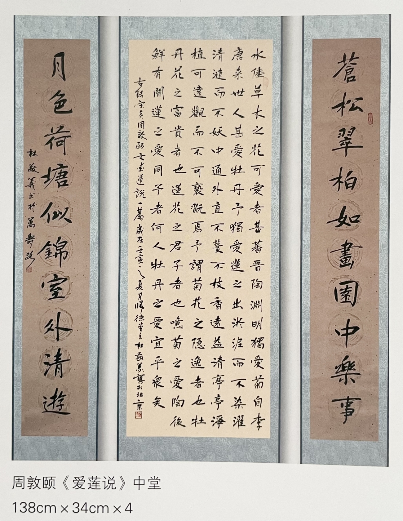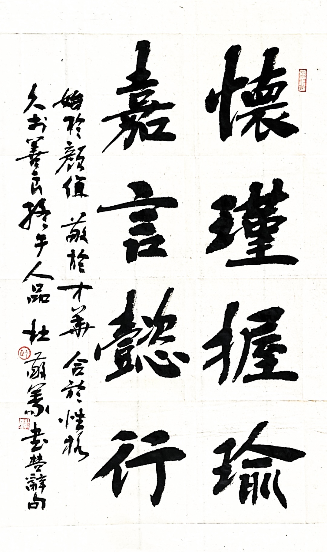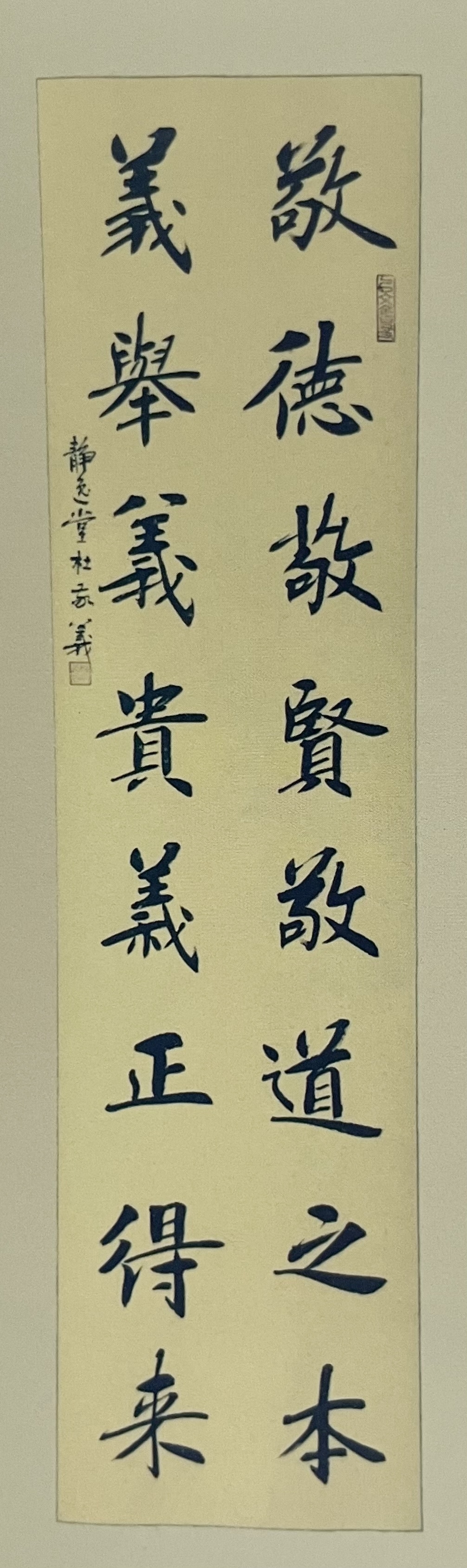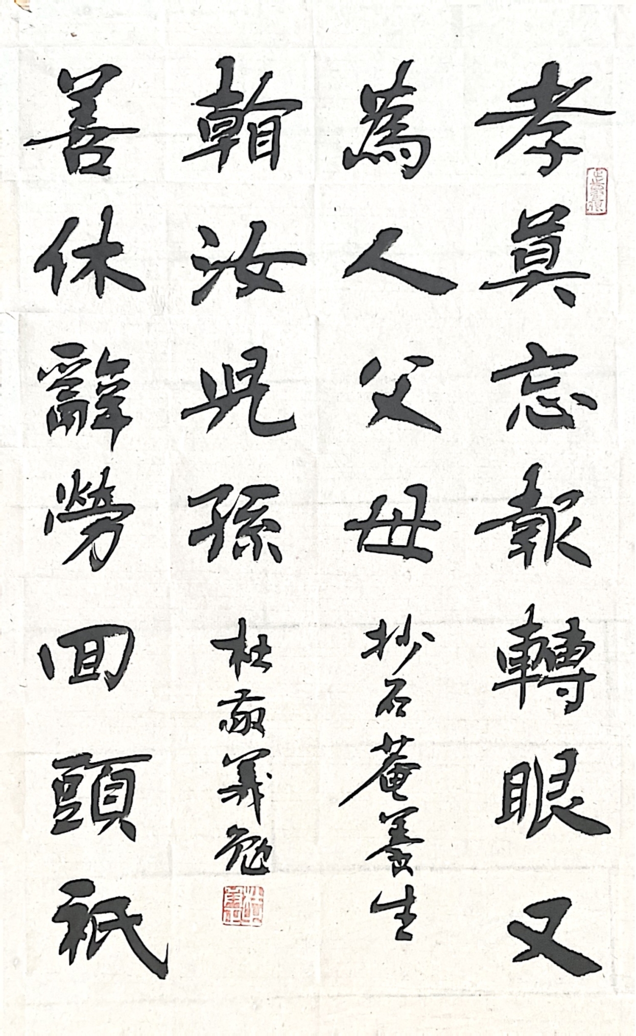 而最近新作的弘一法师格言“以冰霜之操自励,则品日清高;以穹窿之量容人,则德日广大;以切蹉之谊取友,则学问日精;以慎重之行利生,则道风日远”则是另一幅楷书佳作。短短48个字中,他在细微之处穷尽了线条、结体、章法的变化,他把楷书端庄的体态和行书使转的笔调相结合,规矩之中又作放逸之势,笔画均匀,结构紧密,字形平稳,通体有筋骨气力,或快或慢的运笔上下连绵,自然流畅,萧散恬淡,清劲舒朗,挺拔中含朴质,清隽中见风骨,摒弃一切繁琐的用笔,达到了内秀外实的和谐统一。除此之外,杜敬义还出版有《杜敬义楷书字帖》《杜敬义书法韵歌》和《楷书精写百法》以及蒙学知识《千字文》《百家姓》《三字经》《楹联百幅》《二十四诗品》等楷书字帖。