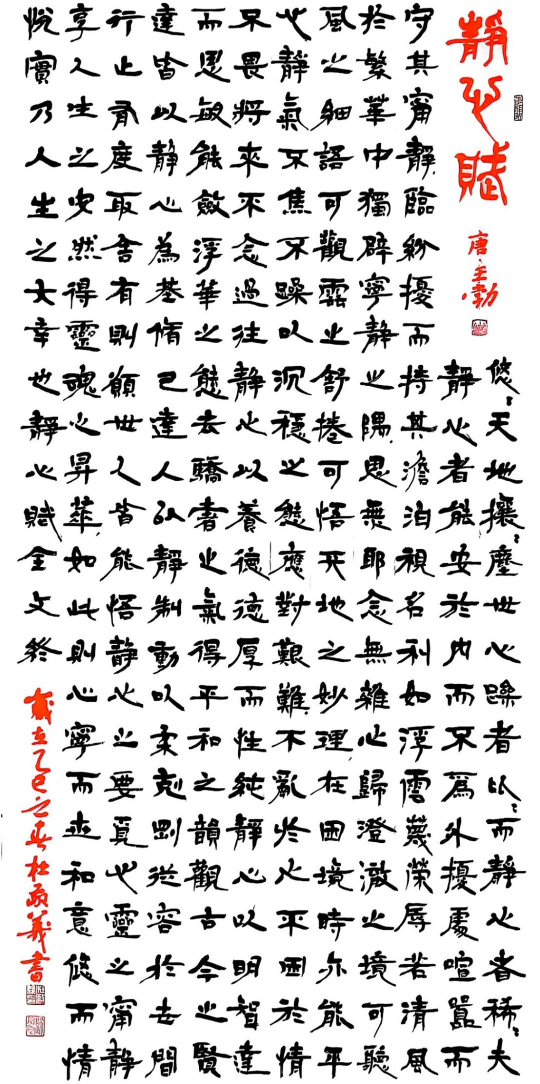 “书法习练本是一门艺术,一定要从基础的点画入手,切忌浮躁,只有练就了扎实的基本功,才能在书法上有所得。”杜敬义极为注重古人的笔墨技法,他忠于先贤,注重传承,兼收并蓄,融会贯通。他以褚楷为主,临习过褚遂良的《雁塔圣教序》和《大字阴符经》等,同时取法魏碑神品《郑文公碑》、元氏墓志以及大唐名碑《等慈寺碑》,从而形成了空灵潇洒、活泼劲健的笔墨情趣,其楷书作品结体均匀,疏密有度,布局恬淡从容,疏朗明净,他以行书的笔意写楷书,端庄的字体中寓予着灵动,方圆兼备,波势自如,字与字之间的互动,行与行之间的呼应,线条的粗细明暗、墨色的浓淡干湿、笔势的跌宕起伏、气韵的接连贯通,无一不透漏着美感。