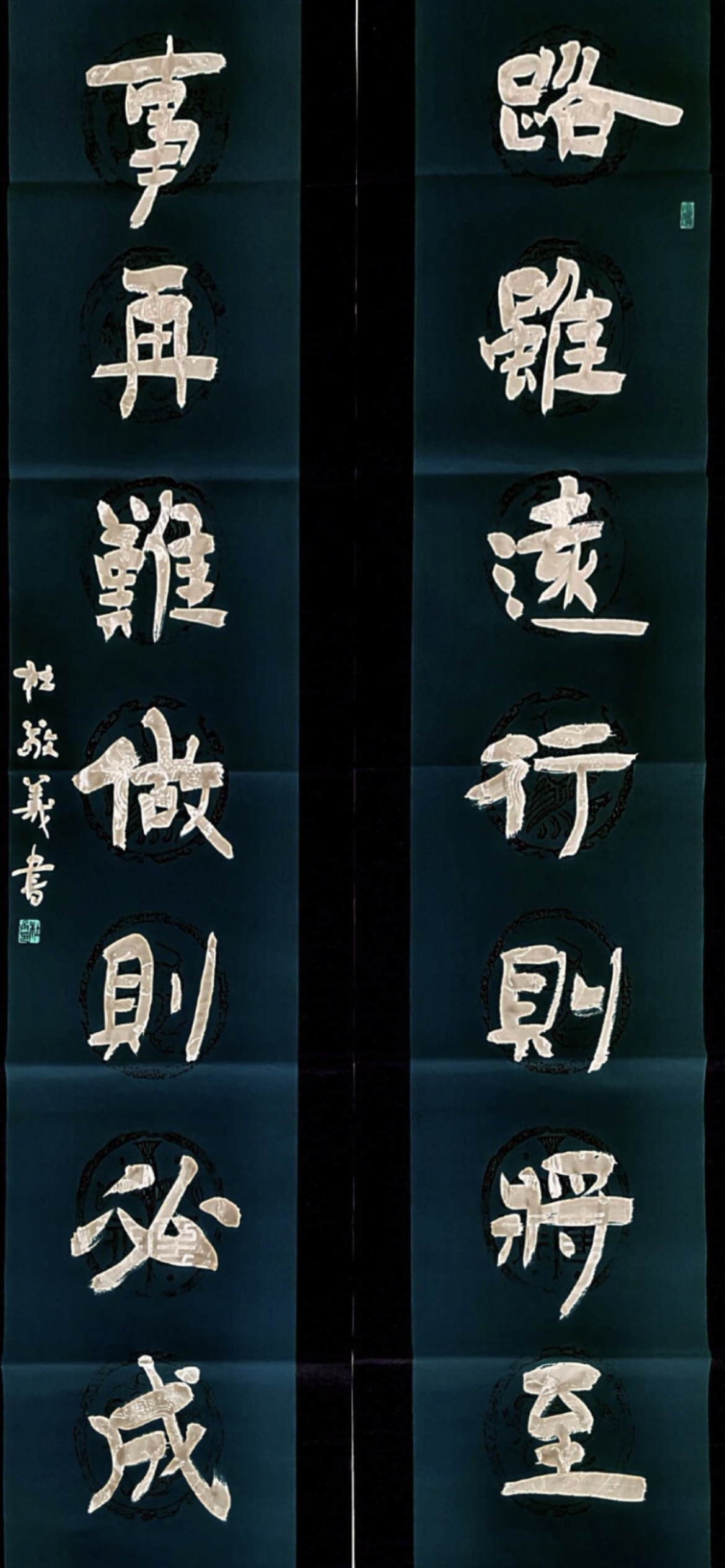 杜敬义出生于中原大地,作为古老文化的发源地,这里有着丰厚的历史遗存。他自幼深受家学熏陶,痴迷于方块字点画艺术,在父亲的悉心教导下,他在书法上刻苦钻研,学而不倦,未曾懈怠。手持的第一本启蒙字帖便是遒劲秀美、法度严谨的《柳公权字帖》,他以此为基础,每日临池尤勤,通过固定的书法结构临摹获得新知,长此以往最终习得一手好看的毛笔字。高中毕业在农村锻炼两年后便入伍参军,即使军事工作繁忙,他也没有放弃对书法的临习,“不论任何书体、任何风格,都必须以扎实的笔墨功夫为后盾。”杜敬义告诉记者。他常常利用业余时间对书法细心苦练,尤其对于所见到的优秀书法牌匾手追心摹,迷醉于这些古朴翰墨的正大气象,由此打下了扎实的书法基础。