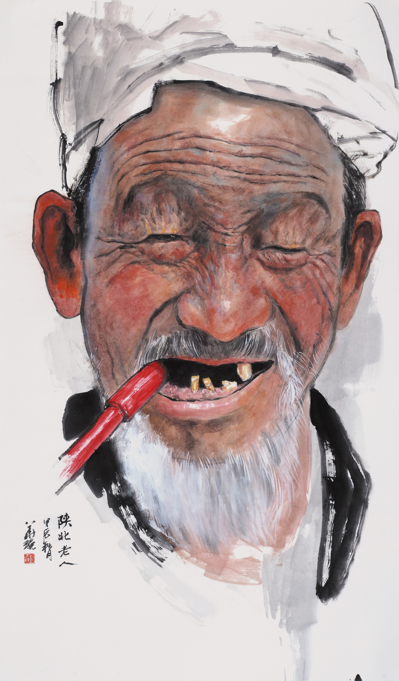彭华竞的笔墨是属于山水画的语言,其大量使用干笔的皴法来塑造形象结构,这干笔之虚,也恰恰使他笔下的形象充满了苍润趣味与灵动,韵味十足。特别是在表现老人的时候,此笔法画出了老人的沧桑与岁月的痕迹,他用干涩的墨与色彩的干笔以及湿润的色彩交织在一起,耐人寻味,画出了有血有肉的生命形态。
