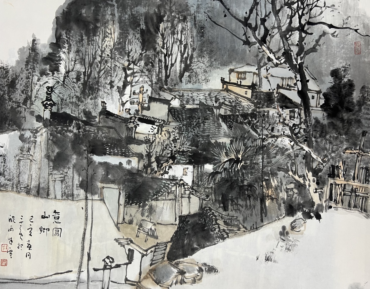 《黄山奇境》中,焦墨勾勒的孤峰尽显嶙峋风骨,呼应着石涛“搜尽奇峰打草稿”的千古意境;《黄河谣》里,赭墨叠加的黄土崖壁雄浑厚重,纤夫的剪影却为山河注入了滚烫的人文温度;《静静的小村》中,淡青湖水环绕着白墙民居,覆雪远山映衬出岁月静好的静谧暖意;《白帝城边》里,虬曲古柏掩映着红墙黛瓦,江舟一叶勾连起千年诗史的家国情怀。
