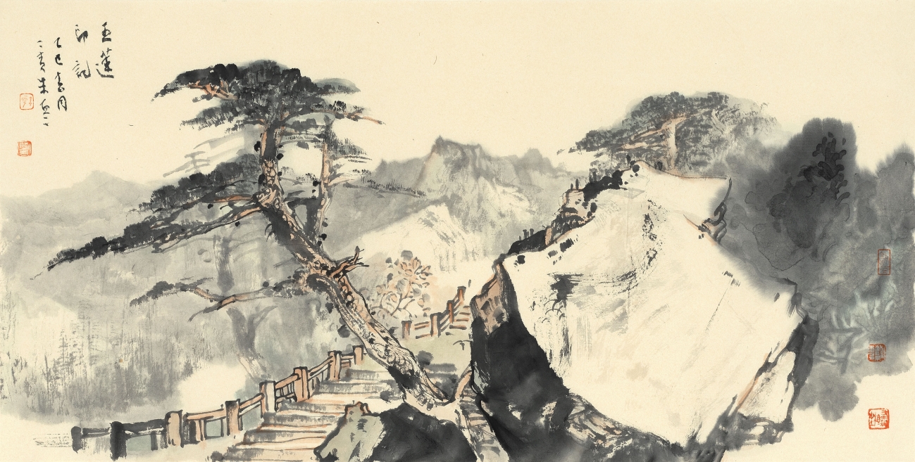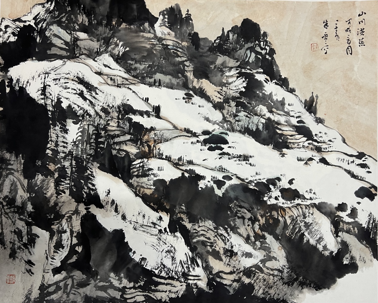 笔墨是国画的灵魂,朱零始终坚守“以书入画,品格为上”的准则。他的艺术启蒙始于书法,深知书法笔意是笔墨的核心——用笔刚劲灵动,以苍茫的书写感赋予画面节奏感;墨色上以水墨为主调,融入赭石、花青等淡色,最终形成了兼具北方山水骨法与南方山水韵味的“北骨南韵”特色。
