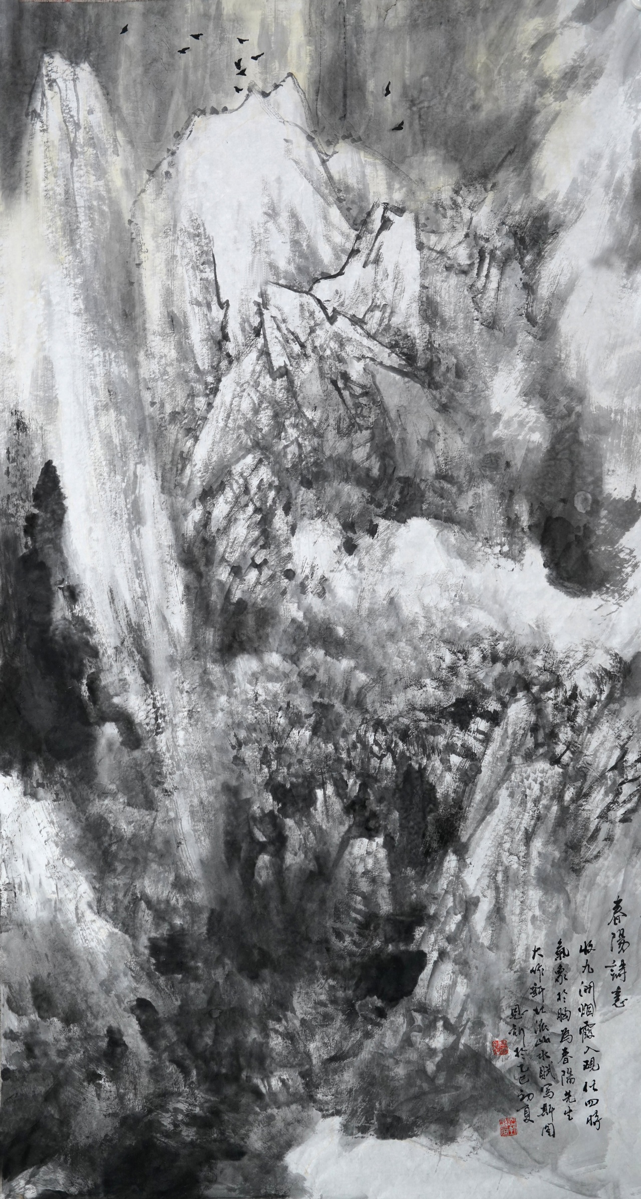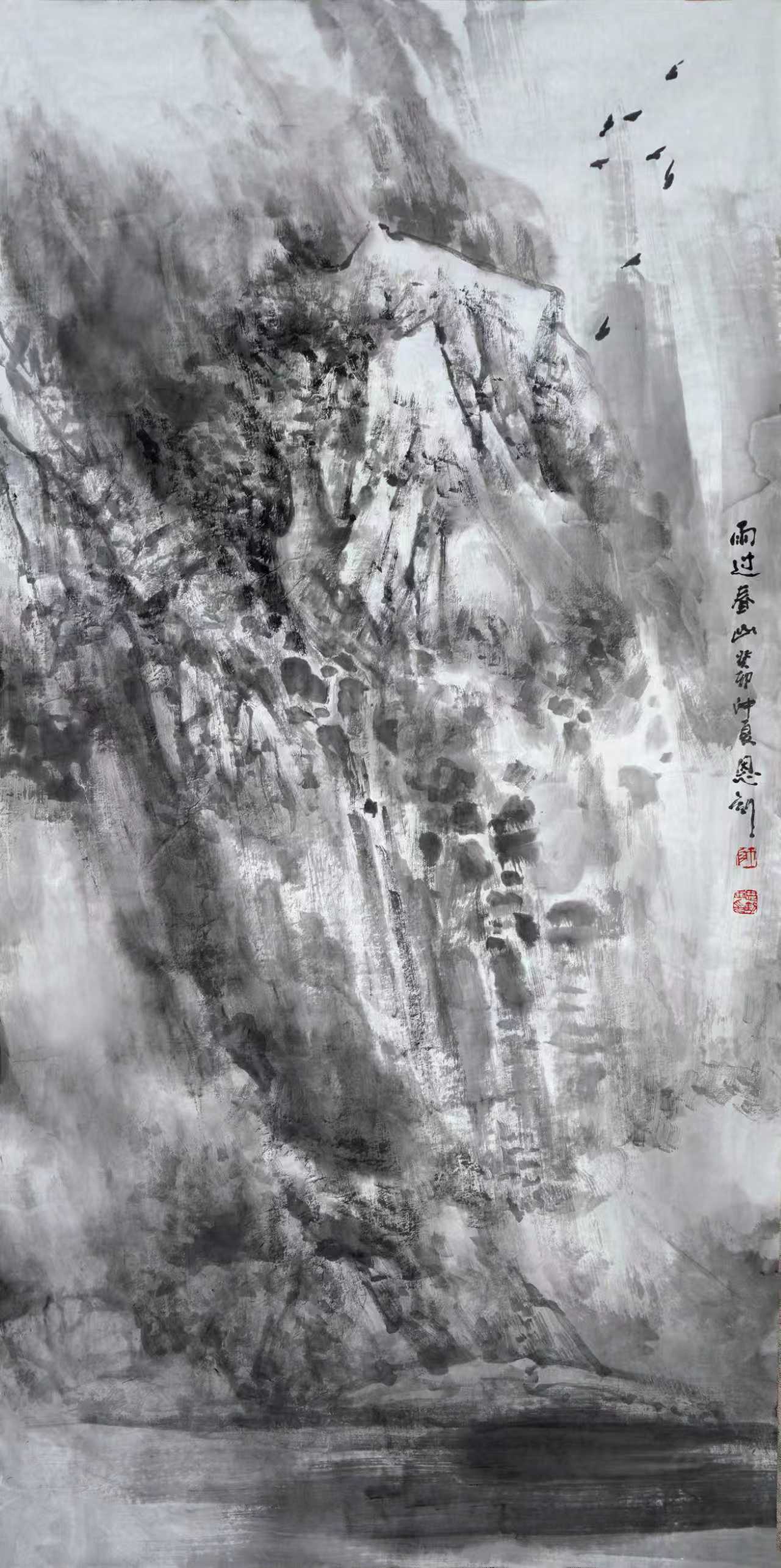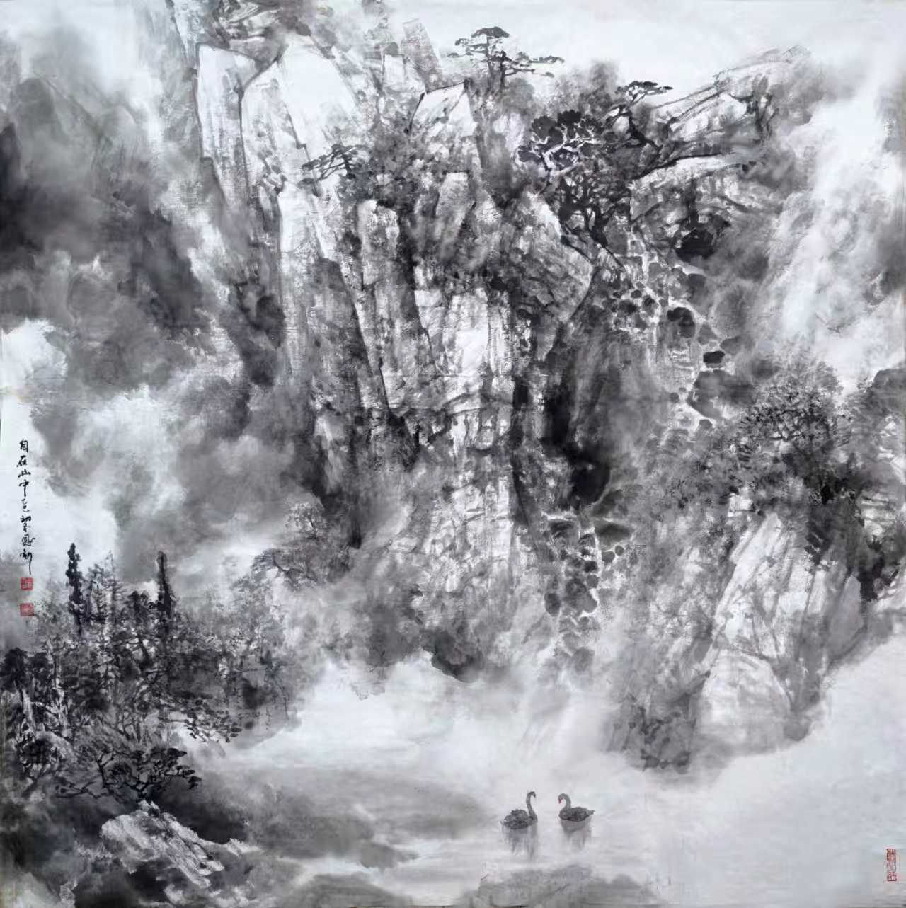 对于山水画的视觉冲击力,墨色的分量与变化,应当起到重要的作用。我在画面上逐渐增加用墨,泼墨和破墨的运用越来越多了,积墨当然也是重要的手段。这具有三个方面的效果。 一,画面上有了大面积多变的的墨色,增添了强烈的黑白灰对比,加强了视觉冲击,这是传统的山水画中所没有的。 二,墨色用来表现自然景观的暗部,反衬出亮部,增强了体积感和光感,在传统中注入了西画的写实素描关系,拉近了人与自然的距离。 三,墨色中浓淡干湿焦水分的把控,加上自然洇化与人为反复加工的效果,将墨色的各种变化发挥到极致,再加上用笔的多种变化,显示出笔墨变幻的无穷魅力,我以为这就是中国画家津津乐道的笔墨。