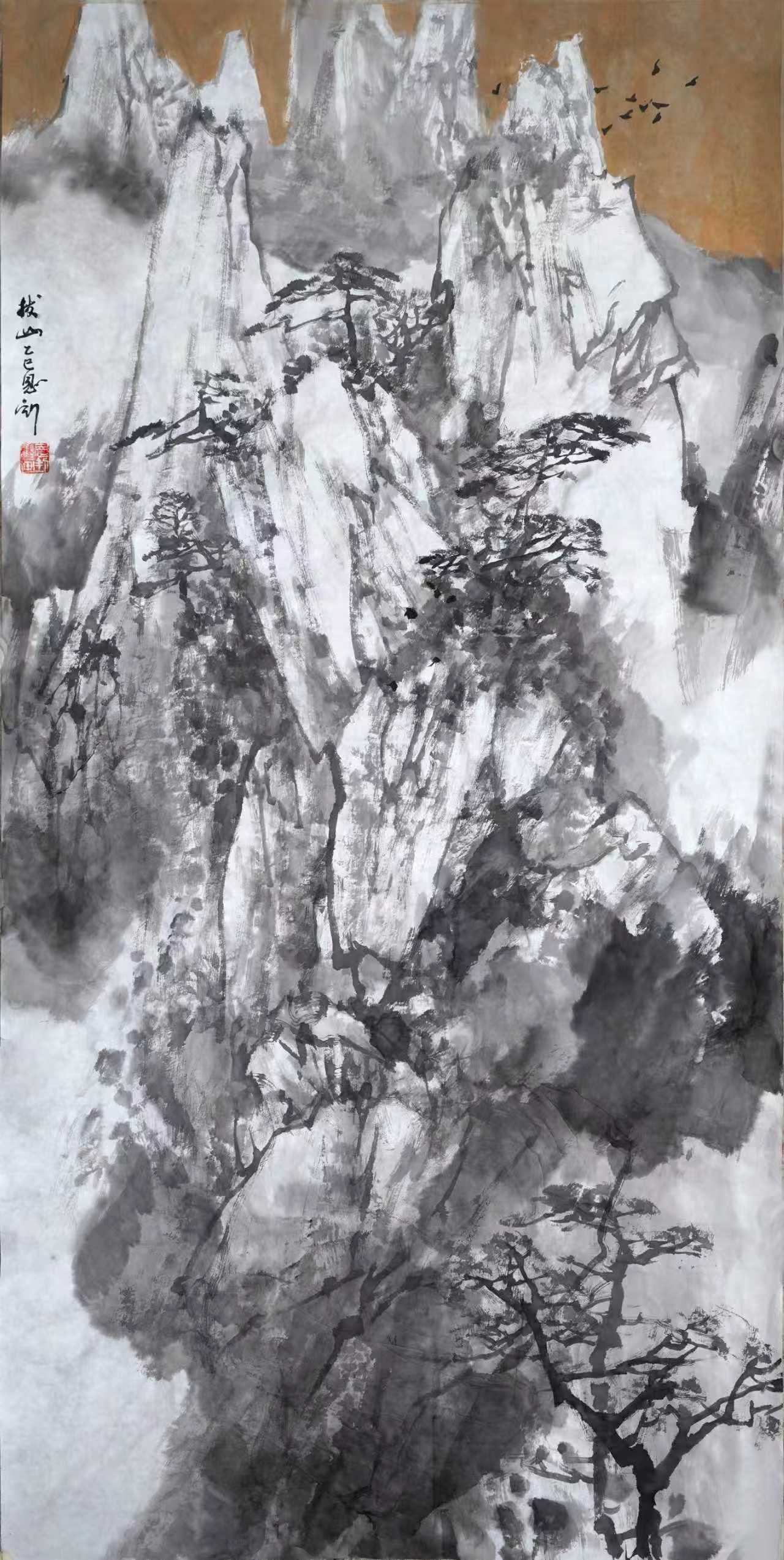 当代出现的新北派山水,具有传统北方山水画派的经典承接。比如塑造大山的形象和精神,比如源于自然而高于自然的“搜妙创真”,还有对画面笔墨的高度重视等等。但是我们一定要从传统的北派山水中跳出来,以一种全新的面貌出现。新北派山水,既要和古人古画拉开距离,也要与同时代的其他画家风格拉开距离,同时也要与过去的自我拉开距离。随着这种距离的拉开,逐步形成自己的绘画面貌,这也就是我们提倡的“变”字。
