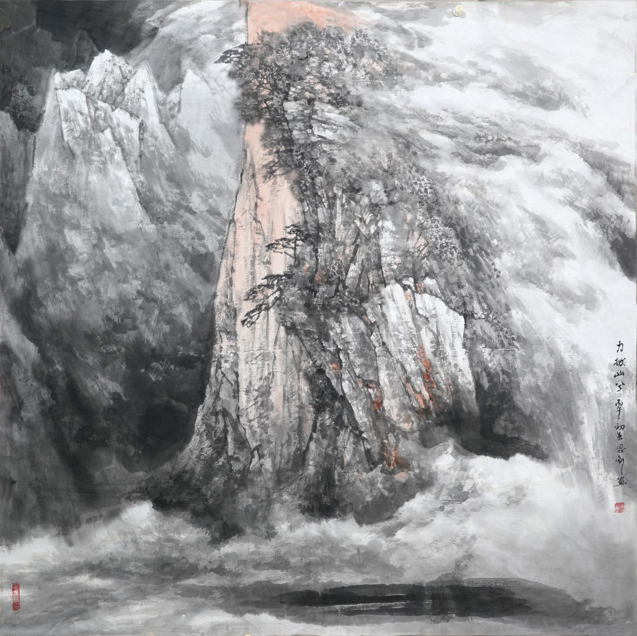 云在传统的山水画中都是留白的,讲求意到笔不到,给人留有想象空间,也是构图的需要。我是在水墨的基础上吸收了西画和摄影,用相对写实的手法,把云的体积结构和素描关系表现出来,并且尽量画出云的各种形态和动势,以动态的云衬托出大山的雄姿,增强画面的动感。云彩在山水画中不再是清雅的留白,而是强烈地参与了北派山水雄强气势的塑造,使山水画不再是静谧的幽境,而是大自然律动的生命。多年来我常用笔触来画云,吸收了油画的用笔,主要强调力度。近年来考虑应当加上水分湿润的淡墨,表现山中的雾气,使强烈的云块和滋润的云雾结合在一起,才更加贴近自然。