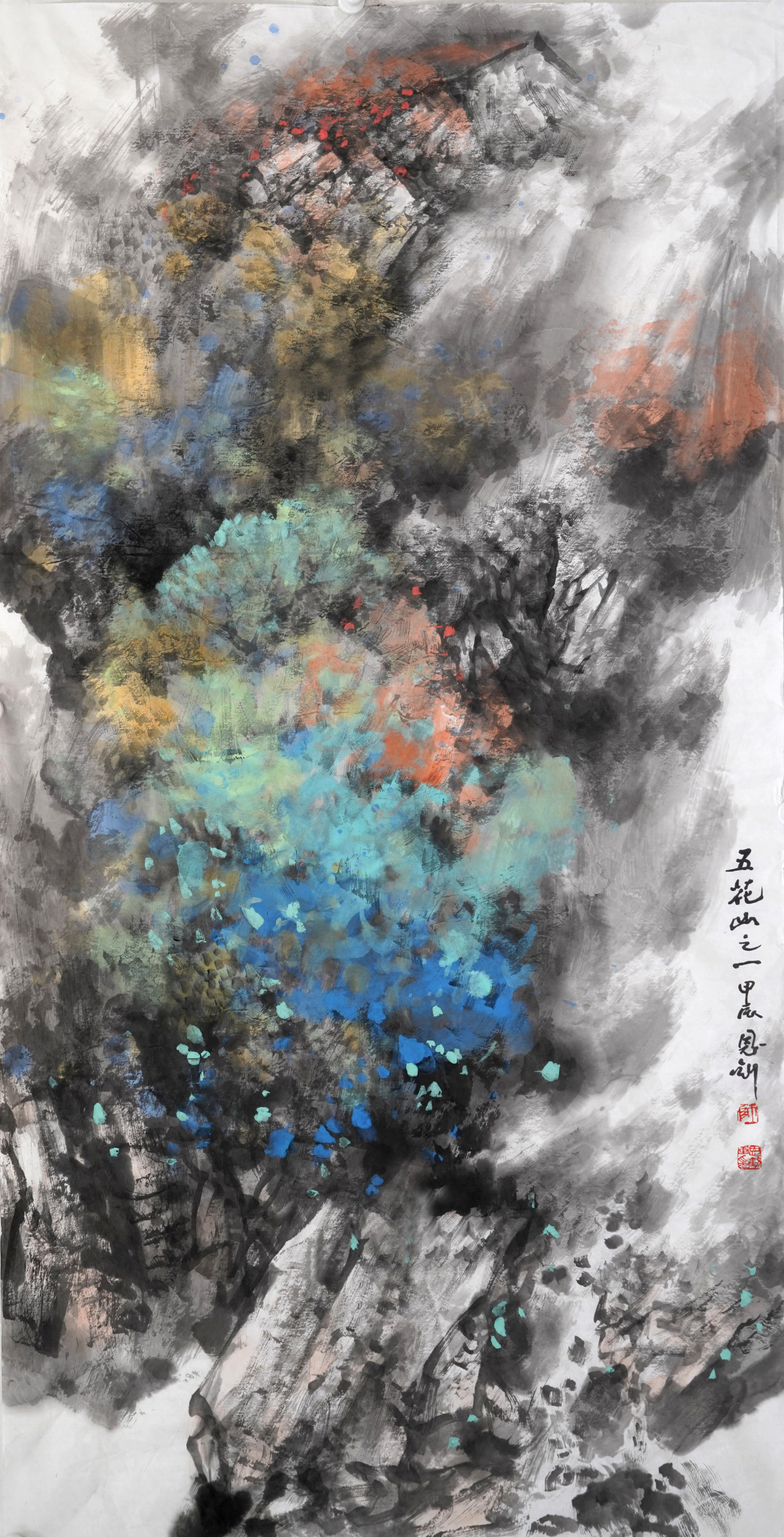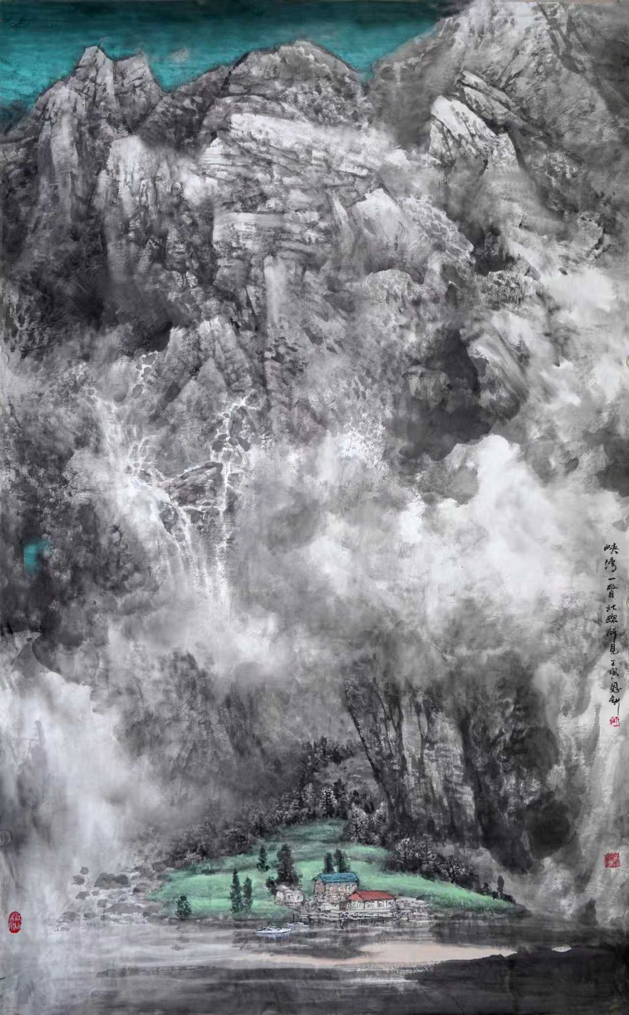 把色彩引进山水画,是一项值得研究和琢磨的工作,新北派山水之新,也包括在色彩上与传统山水画拉开距离。传统的山水画,一般以水墨为主,但也有运用石色为主的青绿山水画,更多见的是在水墨画中施以赭石,花青等的浅绛山水。我觉得新北派山水的设色要与青绿山水和浅绛山水区别开来,可以引进西画的色彩,却又完全不同于西画。要体现色不碍墨,不能随意将颜色覆盖在墨色之上。我早先也有过在整幅水墨画上染色的先例,但呈现的往往是灰和脏。近些年来,考虑将色不碍墨运用到极致,整幅画以水墨为主,用颜色比较单纯的少数色系,在墨色之外形成色块,与主体的水墨形成强烈的色墨对比,既保持了水墨的韵味,又增添了色彩的视觉冲击力。