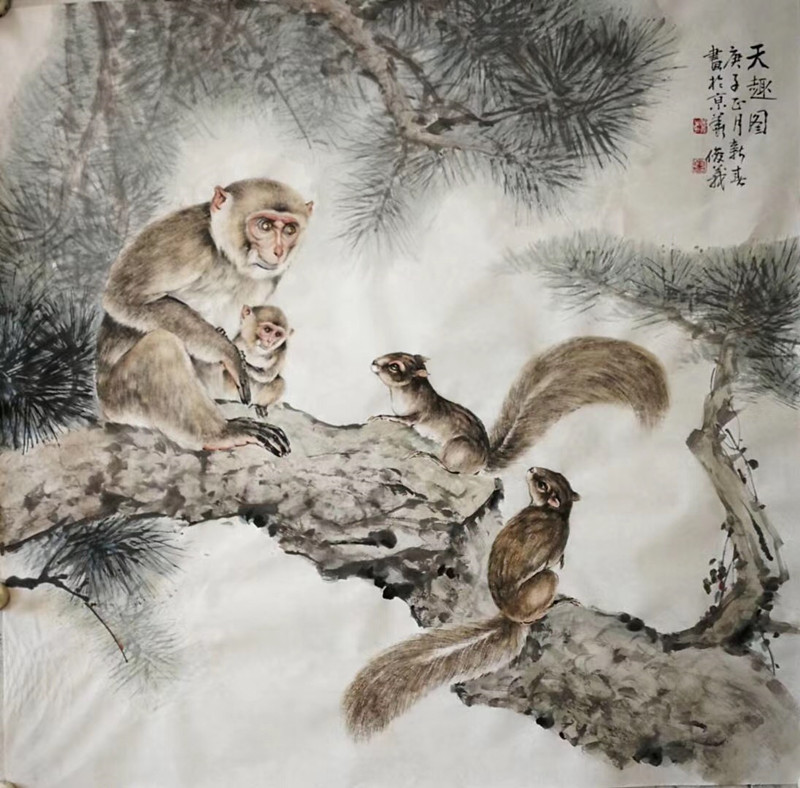 曹俊义:1951年出生、北京人。自幼习画,笔耕不辍四十余年,先初学人物,攻素描色彩。后专画动物,尤擅画猿猴享誉画坛。